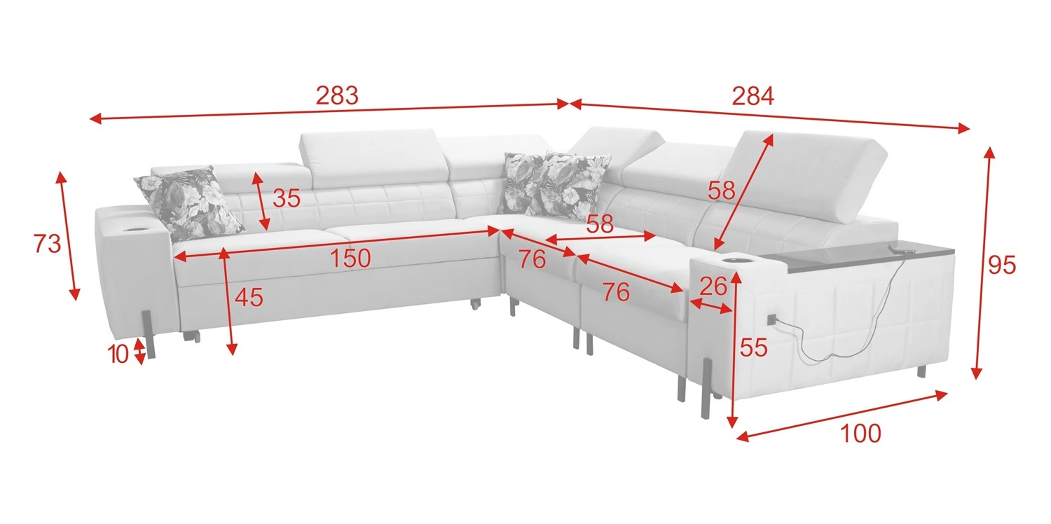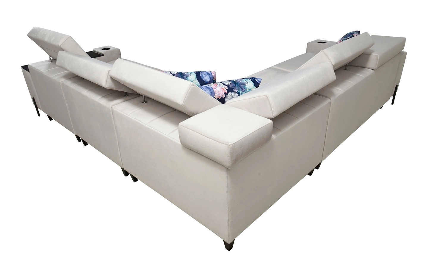 Gewellte Federn und T30-Polyurethanschaum ist das Material, aus dem der Sitz der Ecke hergestellt ist. Feste Rückenlehne mit verstellbaren Kopfstützen ermöglicht eine einfache anpassung sie können die Neigung der Kopfstützen nach Ihren Wünschen einstellen und so für eine bequeme Erholung nach einem langen Tag sorgen, die Sie, Ihre Lieben und auch Ihre Gäste, die auf diesem einzigartigen Ecksofa Platz nehmen, zu schätzen wissen werden!