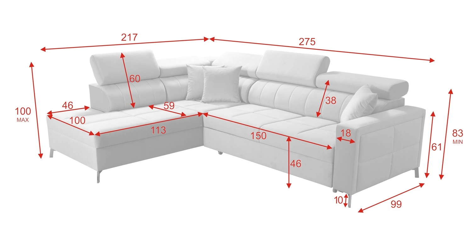 Die Abmessungen der Möbel ermöglichen platz in einem geräumigen Wohnzimmer oder Sitzungssaal zu schaffen. Breite der Ecke 275 cm, maximale Höhe 100 cm und Tiefe 217 cm. Die Liegefläche der Eckeinheit beträgt 127x210 cm. Die Sitzhöhe des Möbels beträgt 46 cm und die maximale Höhe der Rückenlehne beträgt 60 cm. Gewellte Federn und T30-Polyurethanschaum ist das Material, aus dem der Sitz der Ecke gefertigt ist. Feste Rückenlehne mit verstellbaren Kopfstützen ermöglicht eine einfache anpassung sie können die Neigung der Kopfstützen nach Ihren Wünschen einstellen und so für eine bequeme Erholung nach einem langen Tag sorgen, die Sie, Ihre Lieben und auch Ihre Gäste, die auf diesem einzigartigen Ecksofa Platz nehmen, zu schätzen wissen werden.