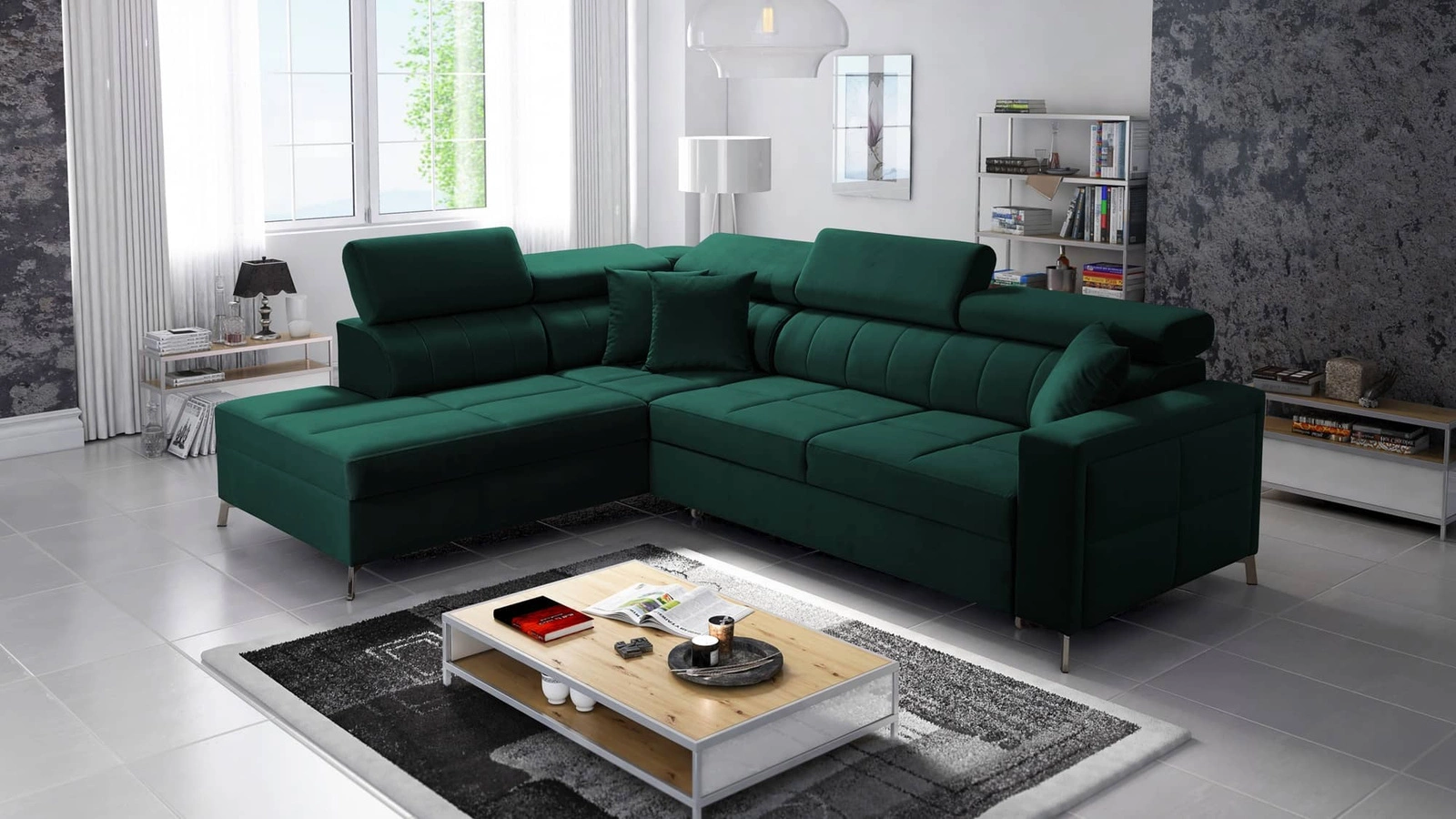 Ecksofa mit Schlaffunktion Nausa III Flasche grün links Samt bequemes Ecksofa verstellbare Kopfstützen Container für Bettzeug
