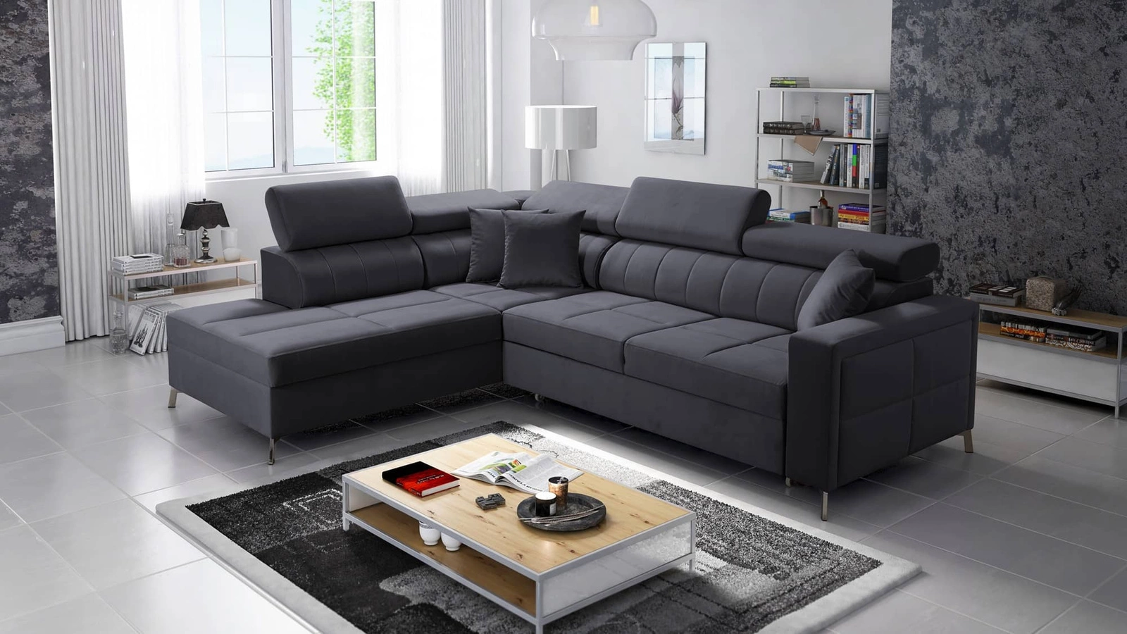 Ecksofa mit Schlaffunktion Nausa III graphit links Samt stilvolles bequemes Ecksofa verstellbare Kopfstützen Bettzeugcontainer