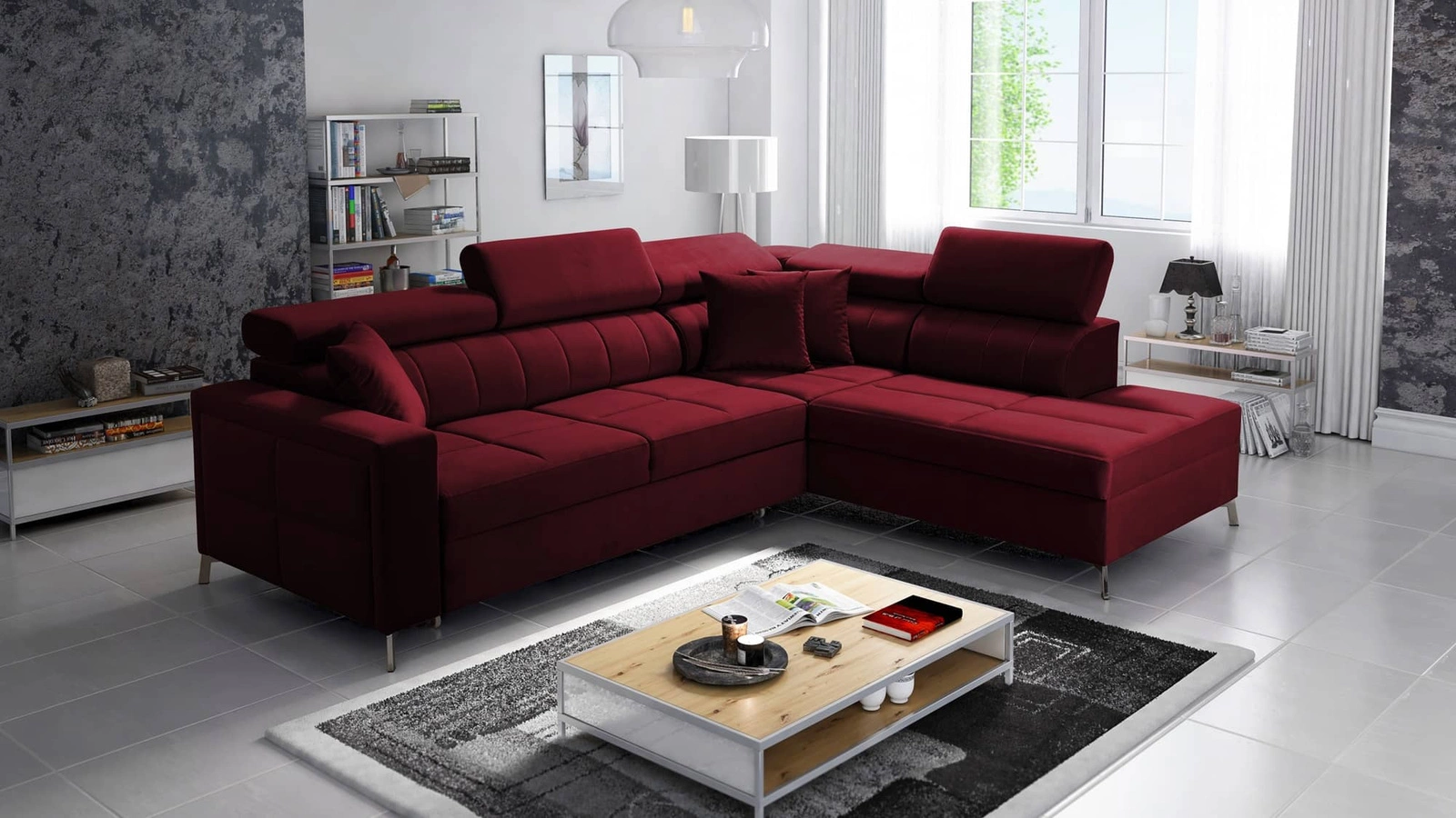 Nausa Ecksofa III in Burgunderrot mit verstellbaren Kopfstützen ist ein elegantes Möbelstück, das sich in jede Einrichtung einfügt.
