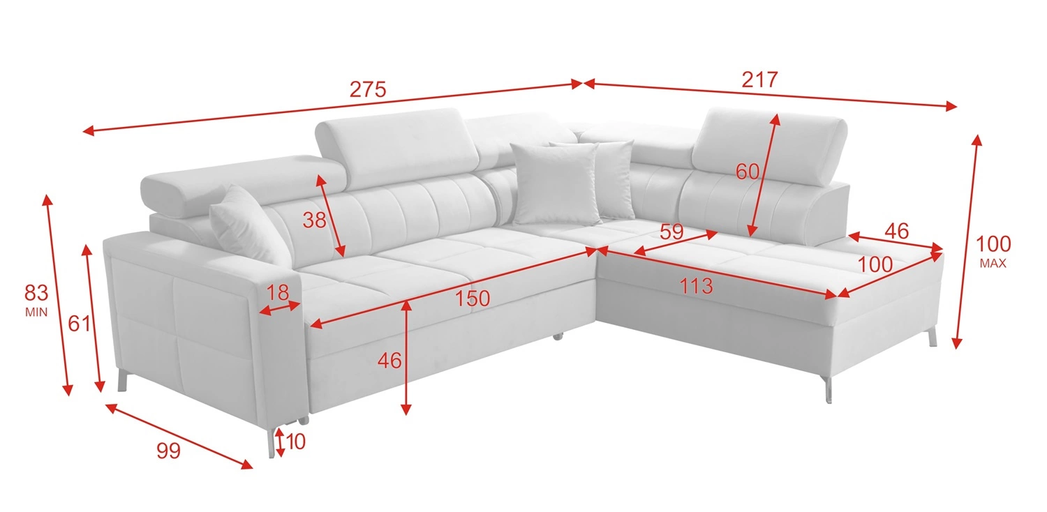 Die Abmessungen der Möbel ermöglichen platz in einem geräumigen Wohnzimmer oder Sitzungssaal zu schaffen. Breite der Ecke 275 cm, maximale Höhe 100 cm und Tiefe 217 cm. Die Liegefläche der Eckeinheit beträgt 127x210 cm. Die Sitzhöhe des Möbels beträgt 46 cm und die maximale Höhe der Rückenlehne beträgt 60 cm. Gewellte Federn und T30-Polyurethanschaum ist das Material, aus dem der Sitz der Ecke hergestellt ist. Feste Rückenlehne mit verstellbaren Kopfstützen ermöglicht eine einfache anpassung sie können die Neigung der Kopfstützen nach Ihren Wünschen einstellen und so für eine bequeme Erholung nach einem langen Tag sorgen, die Sie, Ihre Lieben und auch Ihre Gäste, die auf diesem einzigartigen Ecksofa Platz nehmen, zu schätzen wissen werden.