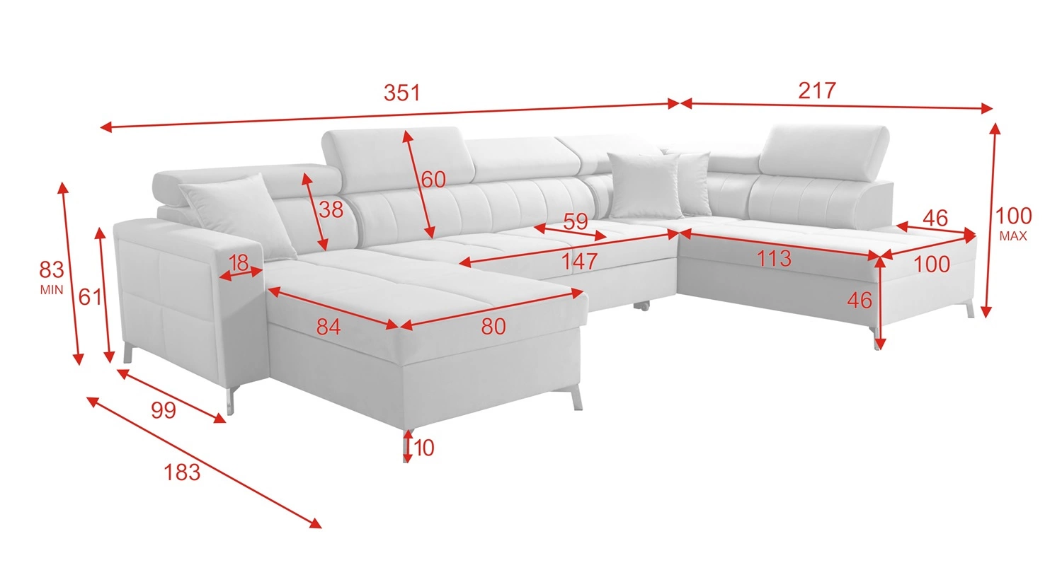 Die Abmessungen der Möbel ermöglichen füllung eines geräumigen Wohnzimmers oder Sitzungssaals. Breite der Ecke 351 cm, maximale Höhe 100 cm und Tiefe 217 cm. Die Liegefläche der Eckeinheit ist 127x286 cm. Die Sitzhöhe des Möbels beträgt 46 cm und die maximale Höhe der Rückenlehne beträgt 60 cm. Gewellte Federn und T30-Polyurethanschaum ist das Material, aus dem der Sitz der Ecke gefertigt ist. Feste Rückenlehne mit verstellbaren Kopfstützen ermöglicht eine einfache anpassung sie können die Neigung der Kopfstützen nach Ihren Wünschen einstellen und so für eine bequeme Erholung nach einem langen Tag sorgen, die Sie, Ihre Lieben und auch Ihre Gäste, die auf diesem einzigartigen Ecksofa Platz nehmen, zu schätzen wissen werden.