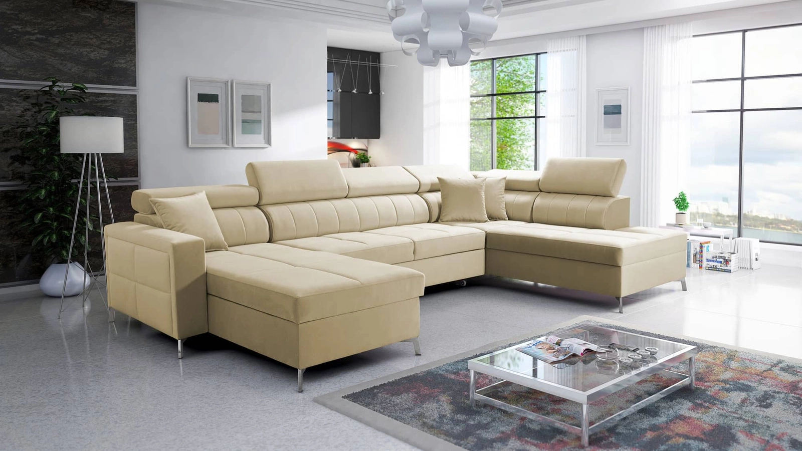 Nausa Ecksofa VI in Beige mit verstellbaren Kopfstützen ist ein elegantes Möbelstück, das sich in jede Einrichtung einfügt.