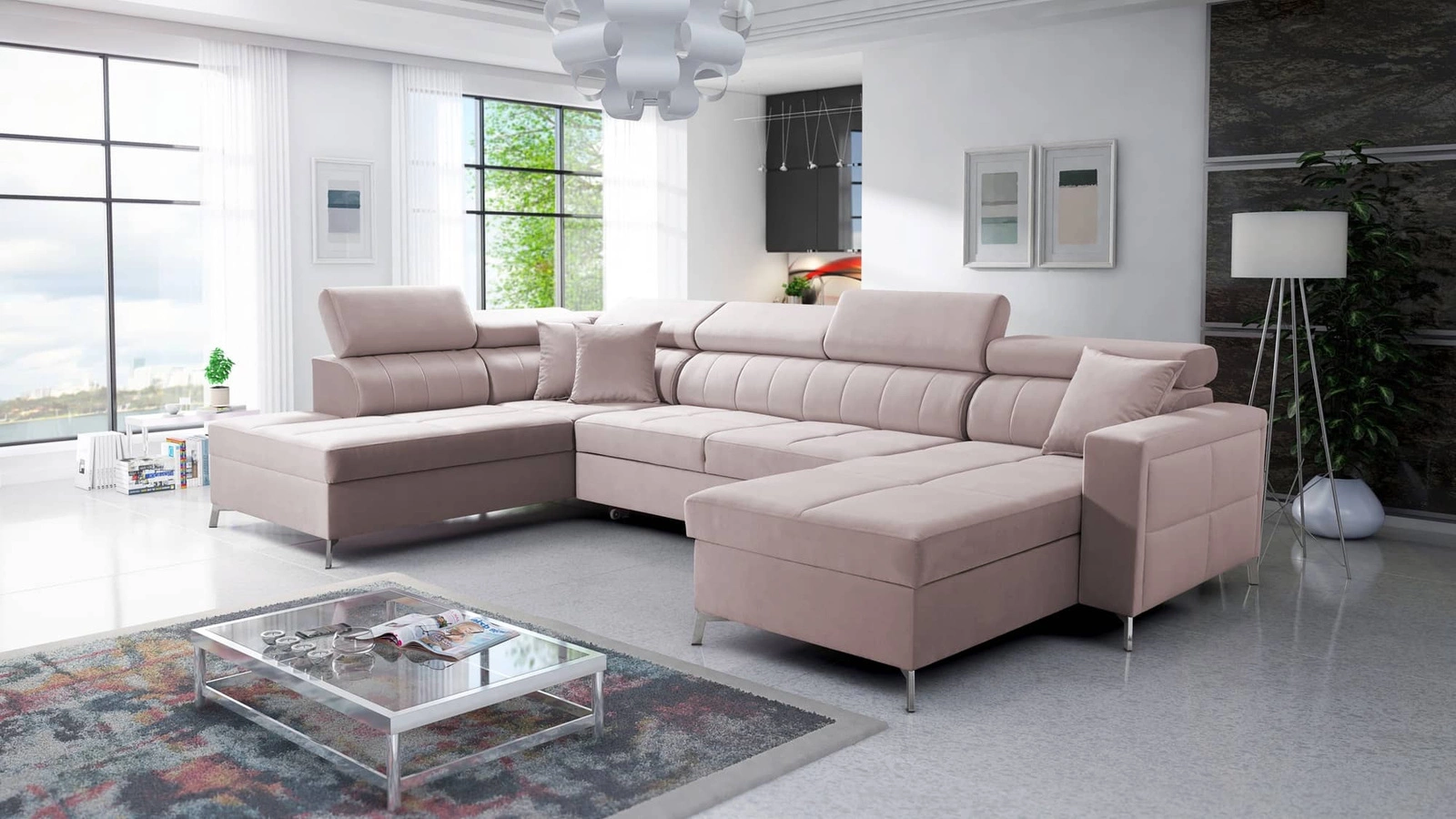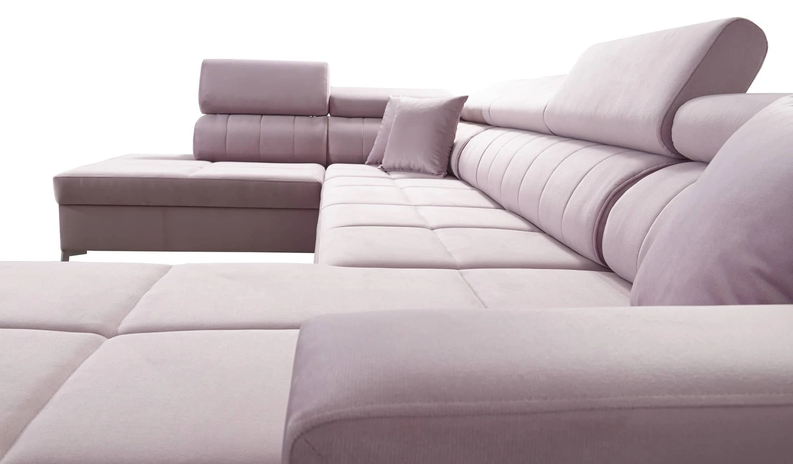 Nausa Ecksofa VI in Puderrosa mit verstellbaren Kopfstützen ist ein elegantes Möbelstück, das in jede Umgebung passt.