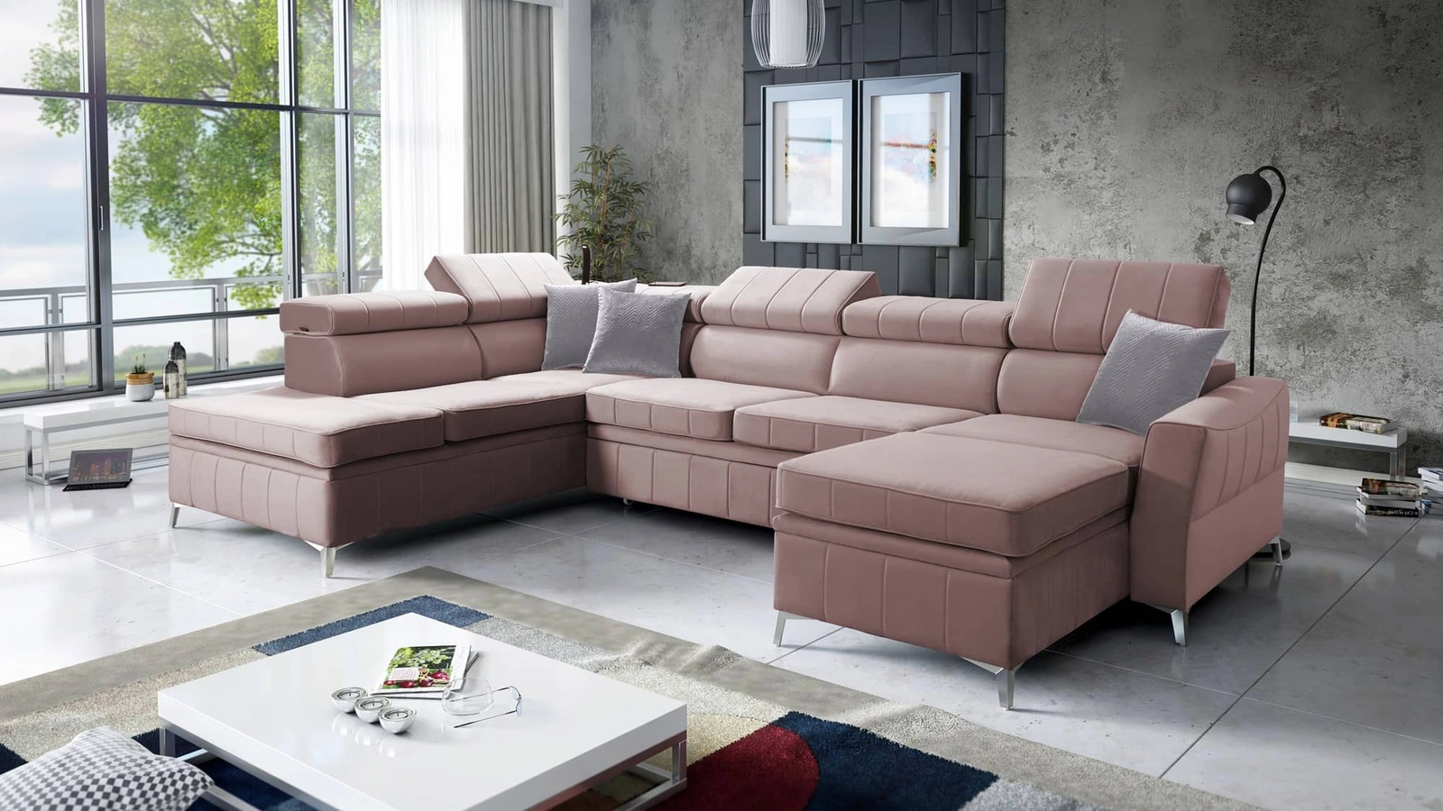 Ecksofa Rava VI in lavendelrosa mit verstellbaren Kopfstützen ist ein elegantes Möbelstück, das zu jeder Einrichtung passt.