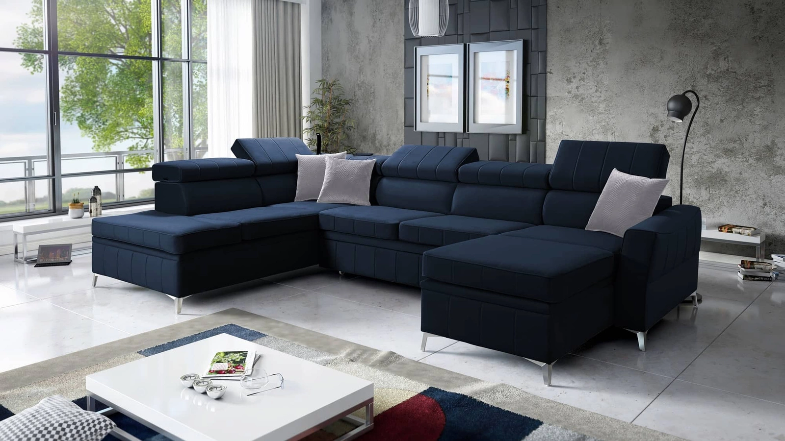 Ecksofa Rava VI in Marineblau mit verstellbaren Kopfstützen ist ein elegantes Möbelstück, das zu jeder Einrichtung passt.