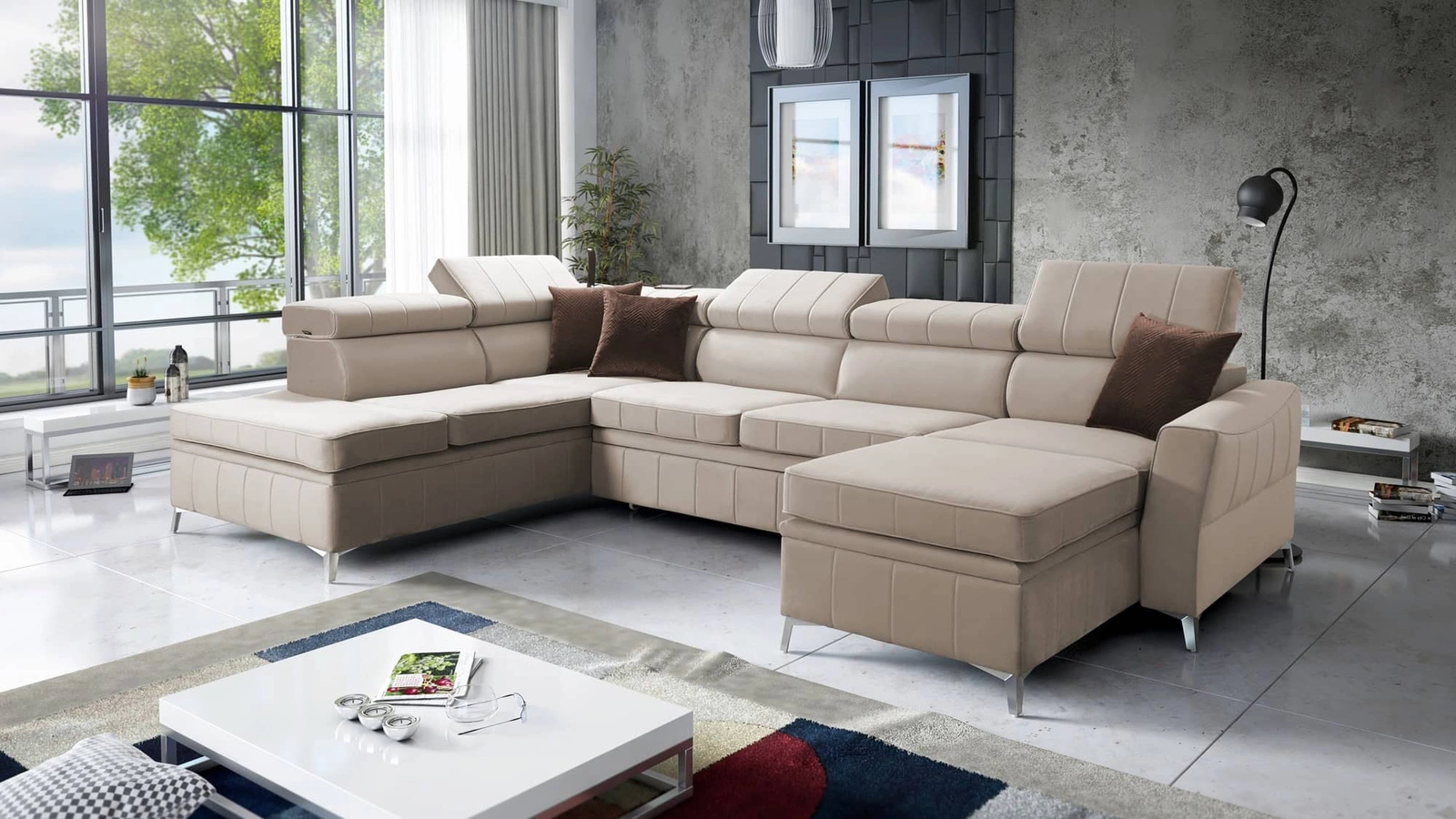 Ecksofa Rava VI in Hellbeige mit verstellbaren Kopfstützen ist ein elegantes Möbelstück, das zu jeder Einrichtung passt.
