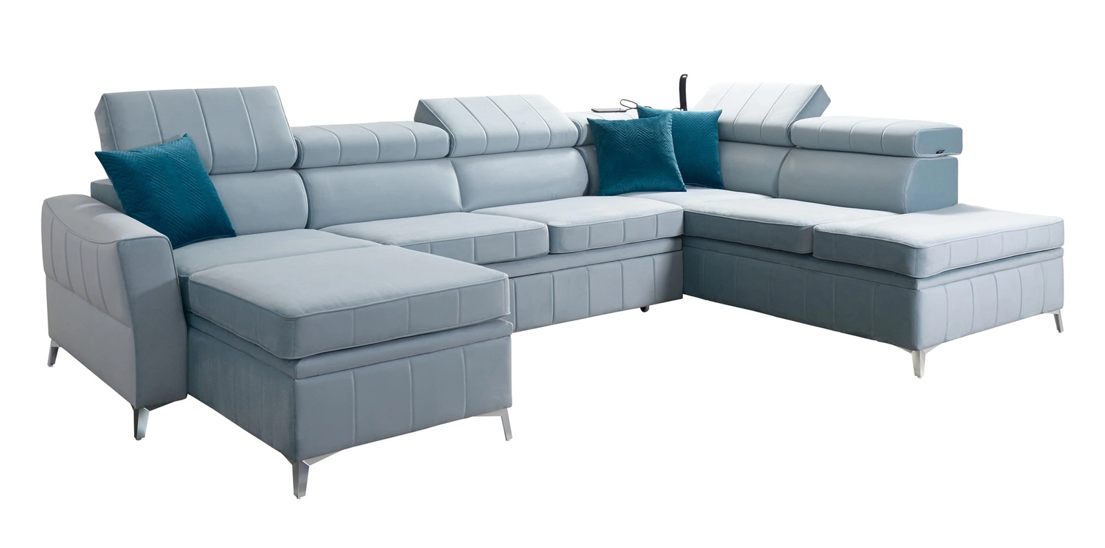 Die Abmessungen der Möbel ermöglichen füllung eines geräumigen Wohnzimmers oder Sitzungssaals. Breite der Ecke 328 cm, maximale Höhe 101 cm und Tiefe 218 cm. Die Liegefläche der Eckeinheit beträgt 131x270 cm. Die Sitzhöhe des Möbels beträgt 47 cm und die maximale Höhe der Rückenlehne beträgt 61 cm. Gewellte Federn und T30-Polyurethanschaum ist das Material, aus dem der Sitz der Ecke hergestellt ist. Feste Rückenlehne mit verstellbaren Kopfstützen ermöglicht eine einfache anpassung sie können die Neigung der Kopfstützen nach Ihren Wünschen einstellen und so für eine bequeme Erholung nach einem langen Tag sorgen, die Sie, Ihre Lieben und auch Ihre Gäste, die auf diesem einzigartigen Ecksofa Platz nehmen, zu schätzen wissen werden.
