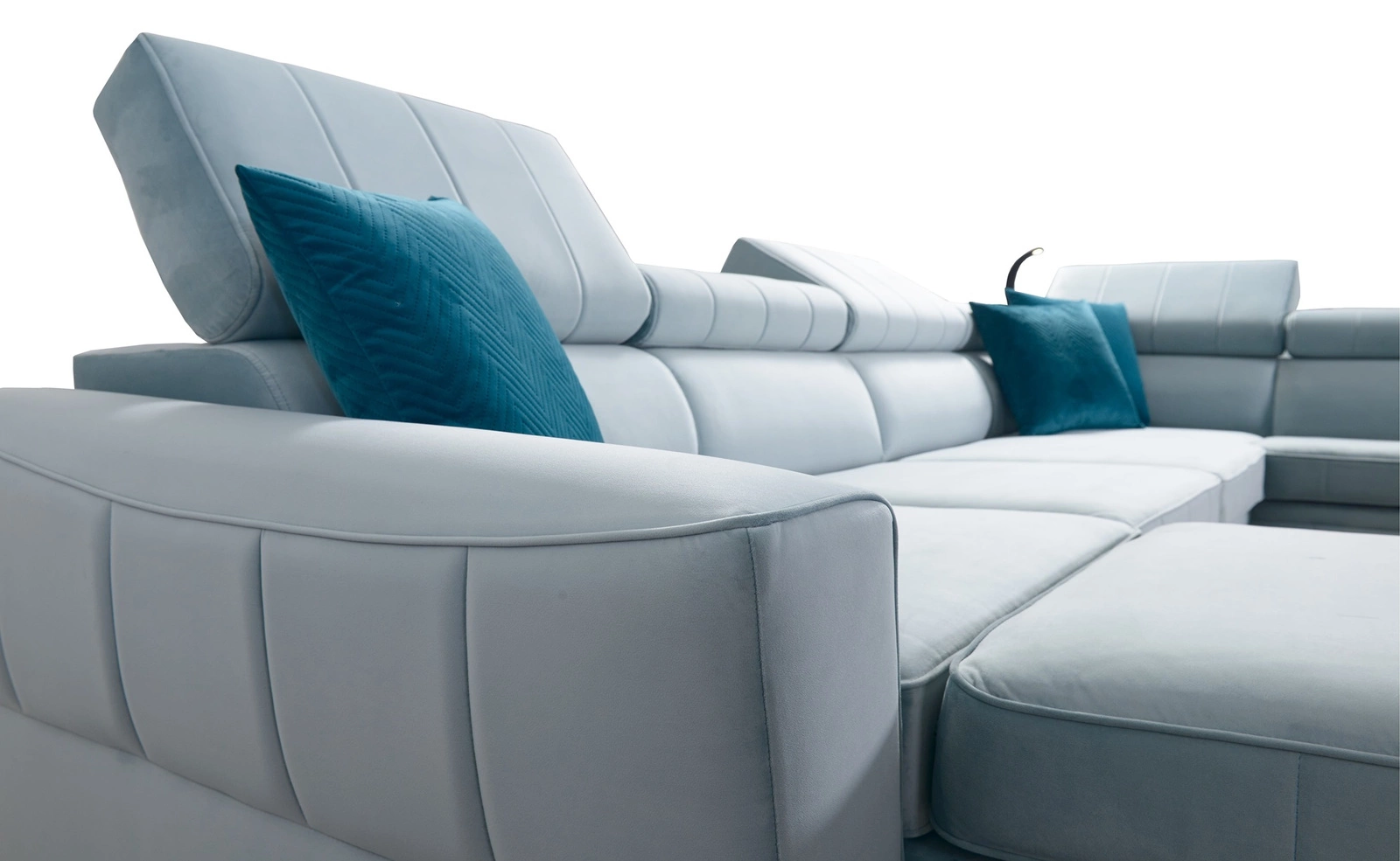 Die Abmessungen der Möbel ermöglichen füllung eines geräumigen Wohnzimmers oder Sitzungssaals. Breite der Ecke 328 cm, maximale Höhe 101 cm und Tiefe 218 cm. Die Liegefläche der Eckeinheit beträgt 131x270 cm. Die Sitzhöhe des Möbels beträgt 47 cm und die maximale Höhe der Rückenlehne beträgt 61 cm. Gewellte Federn und T30-Polyurethanschaum ist das Material, aus dem der Sitz der Ecke hergestellt ist. Feste Rückenlehne mit verstellbaren Kopfstützen ermöglicht eine einfache anpassung sie können die Neigung der Kopfstützen nach Ihren Wünschen einstellen und so für eine bequeme Erholung nach einem langen Tag sorgen, die Sie, Ihre Lieben und auch Ihre Gäste, die auf diesem einzigartigen Ecksofa Platz nehmen, zu schätzen wissen werden.