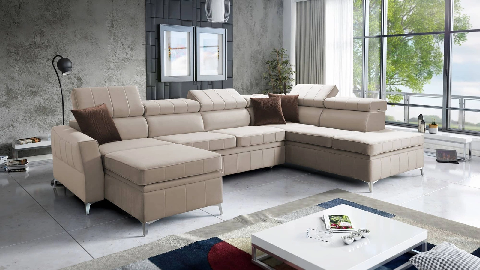 Ecksofa Rava VI in Hellbeige mit verstellbaren Kopfstützen ist ein elegantes Möbelstück, das zu jeder Einrichtung passt.