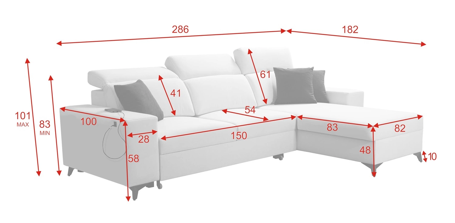 Die Abmessungen der Möbel ermöglichen füllung eines geräumigen Wohnzimmers oder Sitzungssaals. Breite der Ecke 286 cm, maximale Höhe 101 cm und Tiefe 182 cm. Die Liegefläche der Eckeinheit beträgt 122x230 cm. Die Sitzhöhe des Möbels beträgt 48 cm und die maximale Höhe der Rückenlehne beträgt 61 cm. Gewellte Federn und T30-Polyurethanschaum ist das Material, aus dem der Sitz der Ecke hergestellt ist. Feste Rückenlehne mit verstellbaren Kopfstützen garantiert komfortable Entspannung nach einem langen Tag, die Sie, Ihre Lieben und auch Gäste, die auf diesem einzigartigen Ecksofa sitzen, zu schätzen wissen werden.