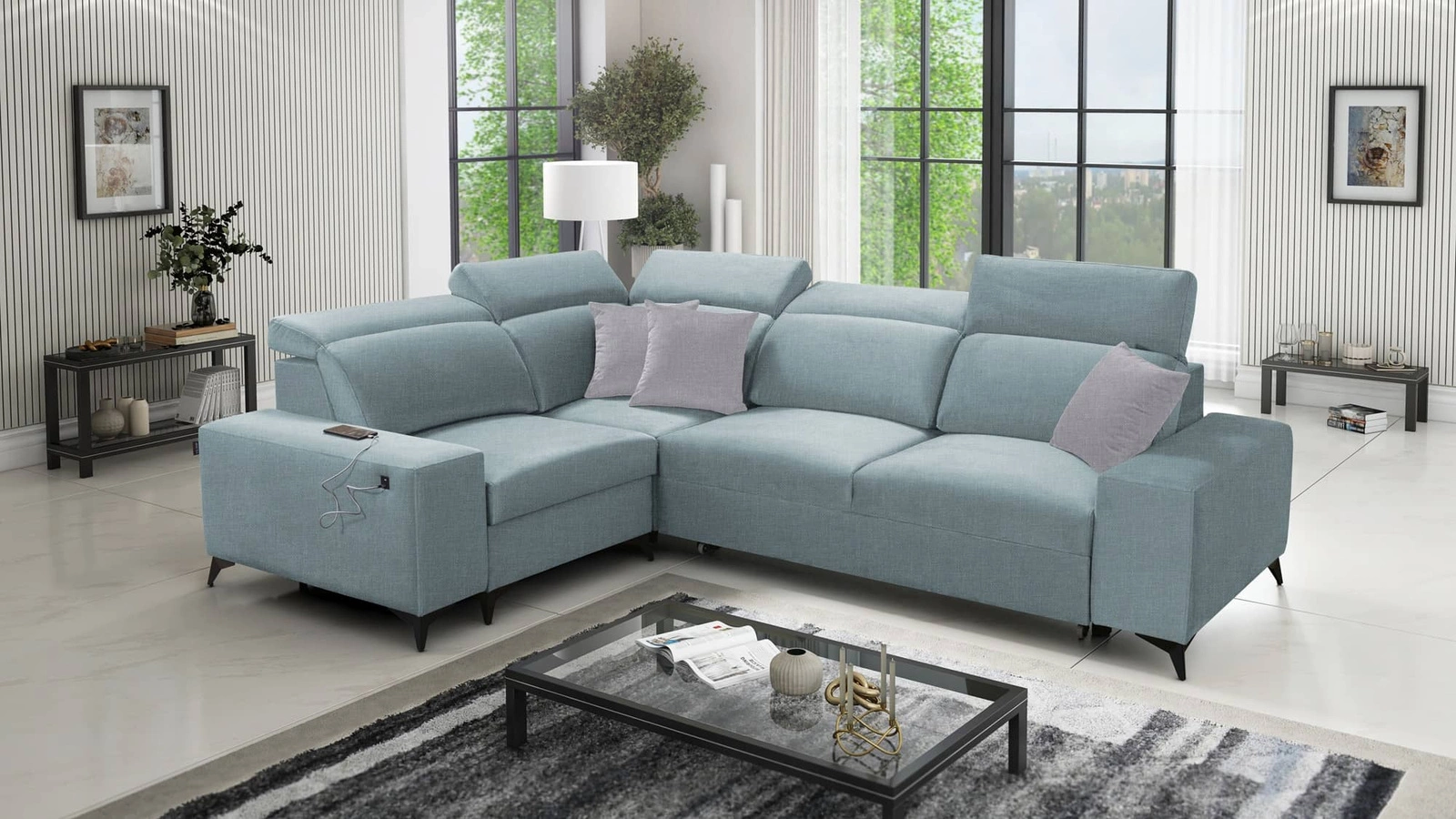 Kelly Sleek Ecksofa II in arktischem Blau mit verstellbaren Kopfstützen ist ein Rezept für eine moderne Inneneinrichtung in Ihrem Haus!