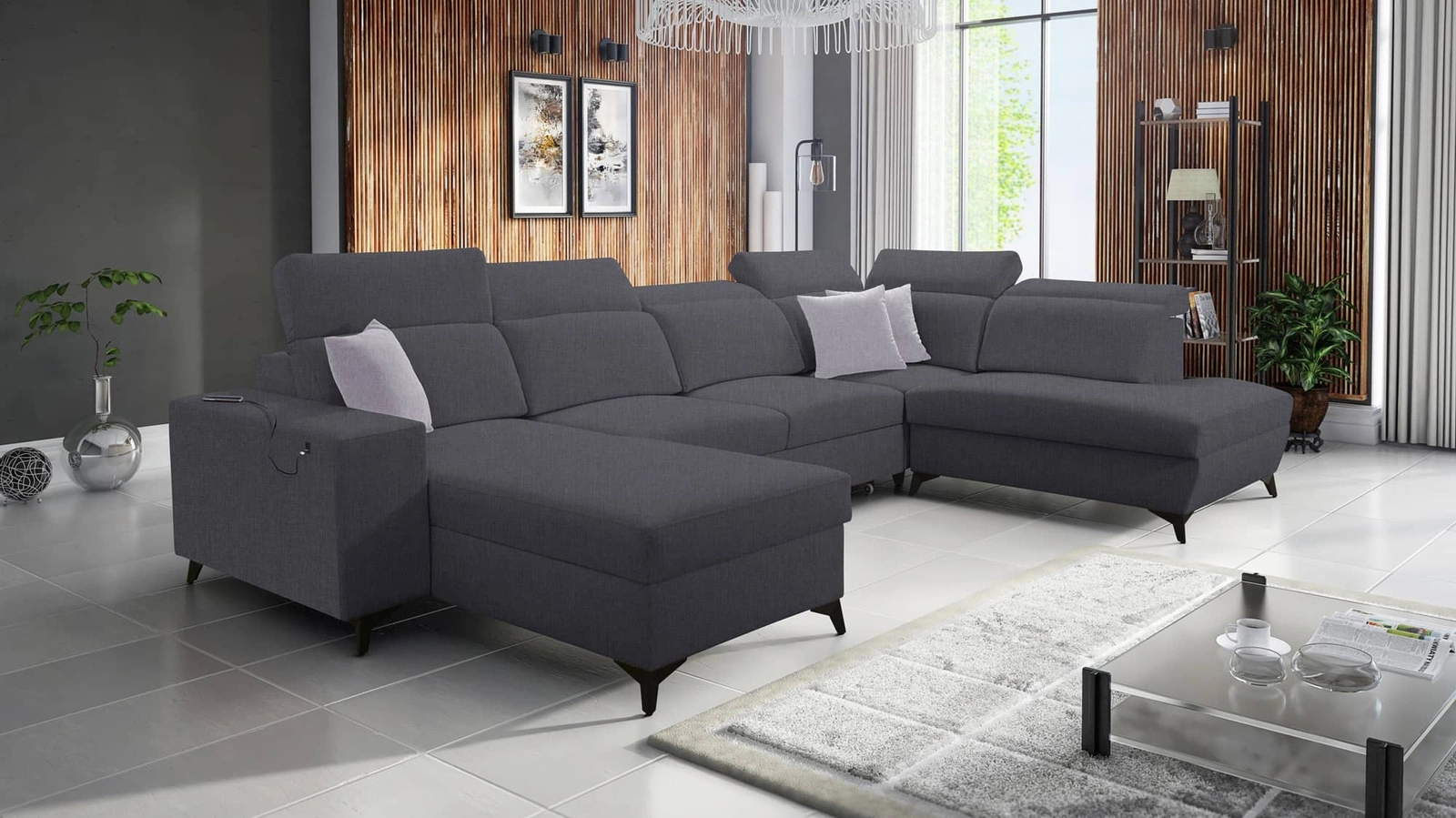Ecksofa mit Schlaffunktion Kelly Sleek VI graphit links modernes Design Ecksofa für Wohnzimmer mit verstellbaren Kopfstützen