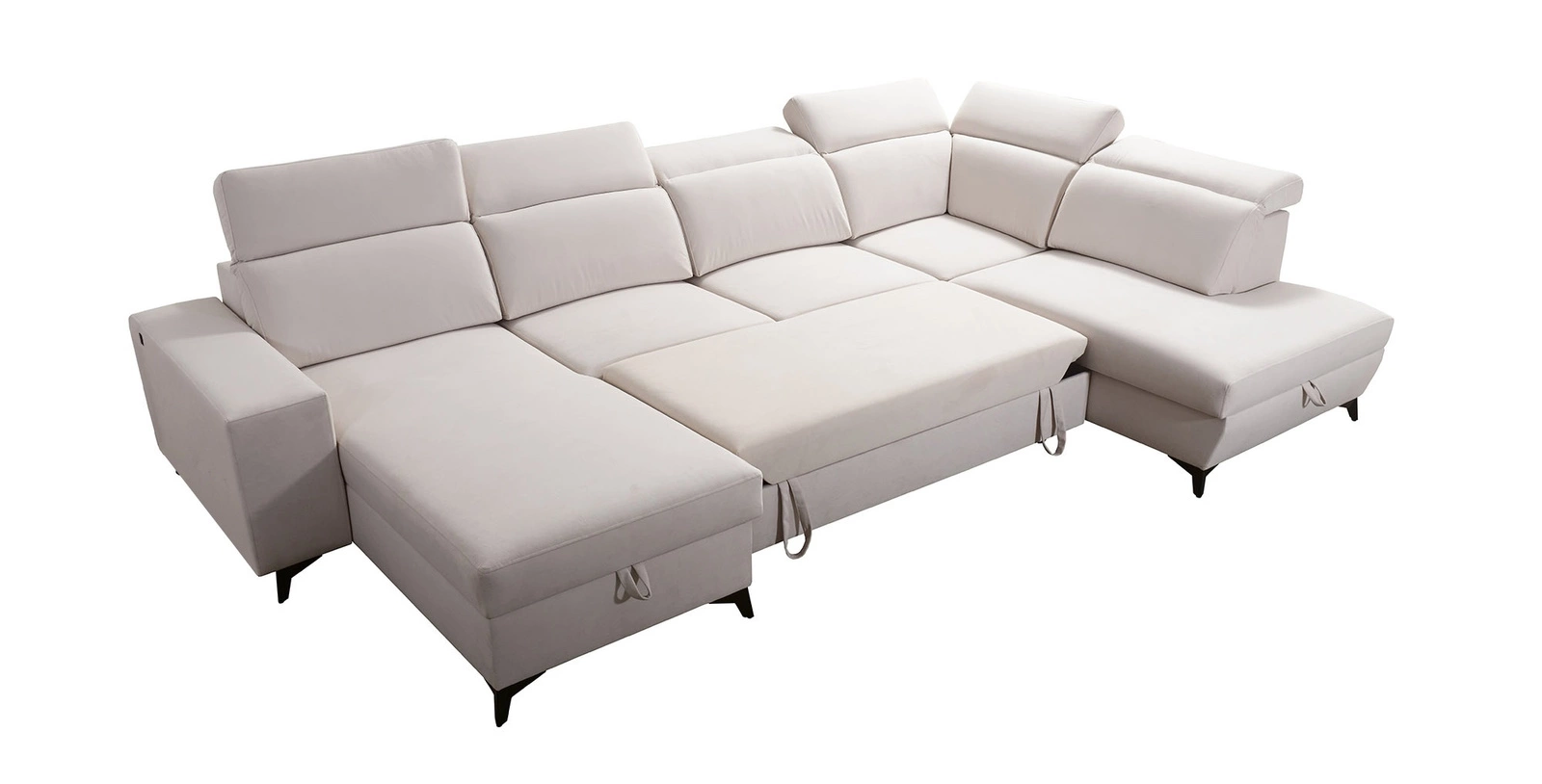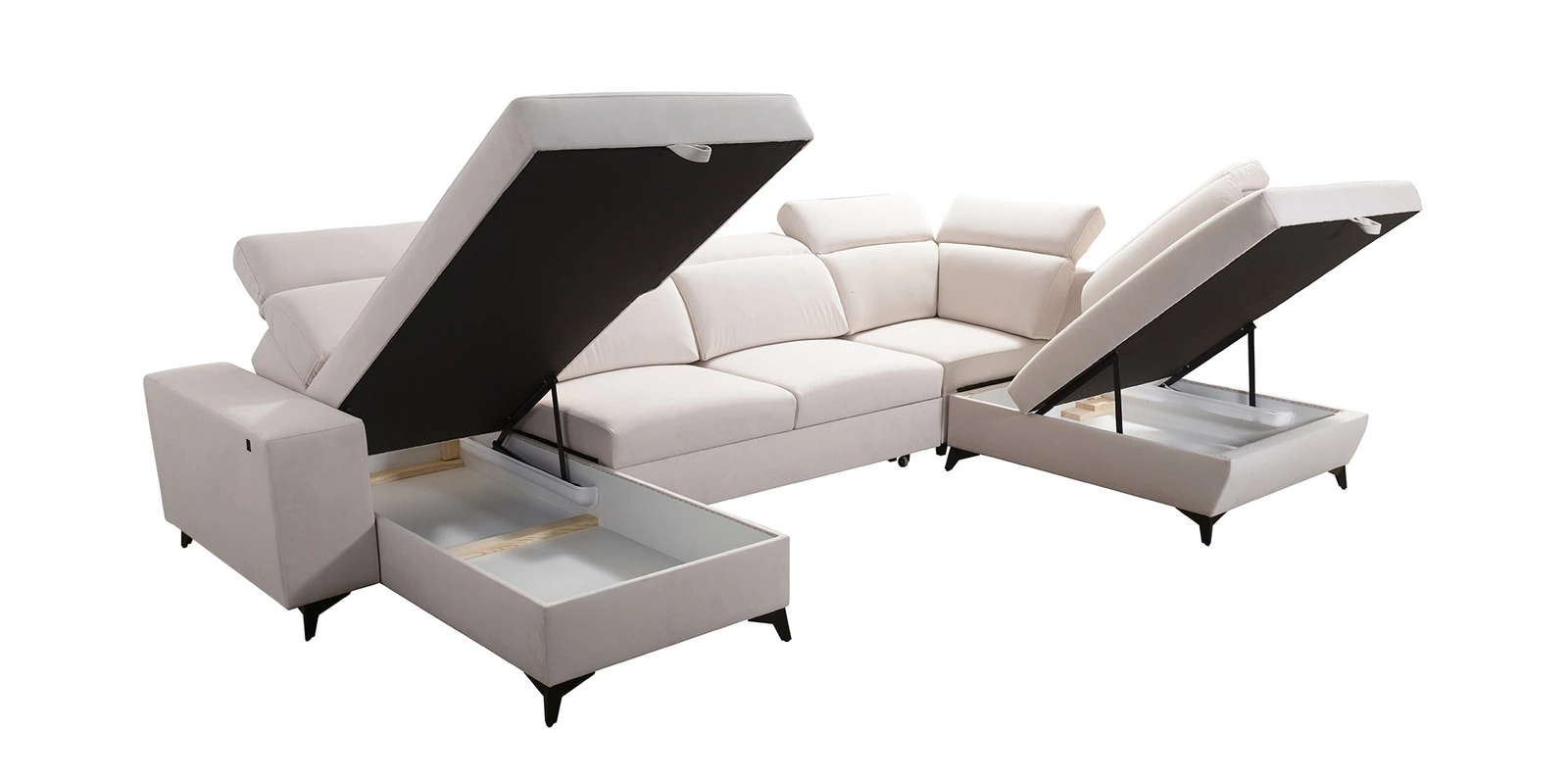 Weitere Merkmale dieses Möbelstücks, die von allen Nutzern geschätzt werden, sind Bettzeugbehälter, eine Schlaffunktion, eine USB-Buchse an der Seite der Ecke zum Aufladen des Telefons und anderer Multimedia-Geräte.