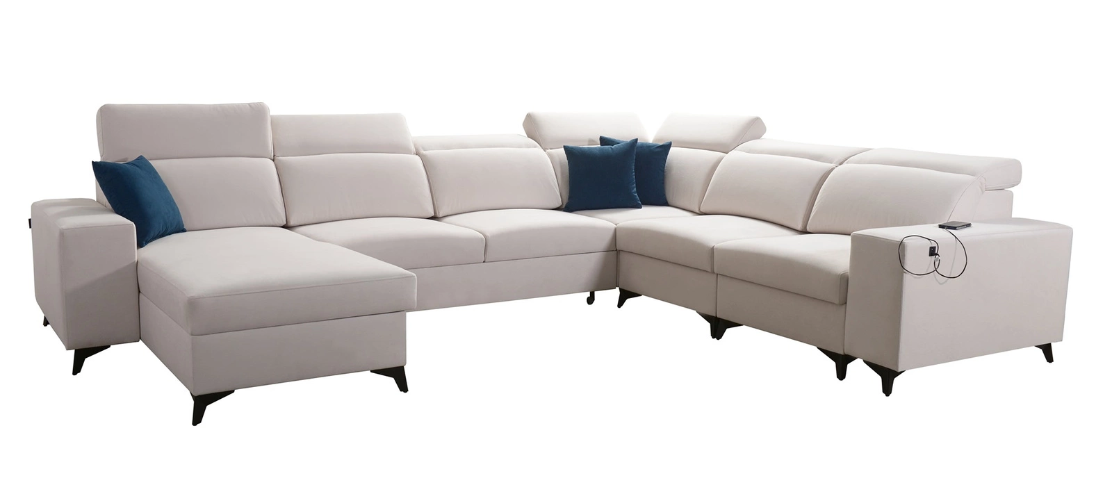 Die Abmessungen der Möbel ermöglichen füllung eines geräumigen Wohnzimmers oder Sitzungssaals. Breite der Ecke 361 cm, maximale Höhe 101 cm und Tiefe 283 cm. Die Liegefläche des Eckschrankes beträgt 122x283 cm. Die Sitzhöhe des Möbels beträgt 48 cm und die maximale Höhe der Rückenlehne beträgt 61 cm. Gewellte Federn und T30-Polyurethanschaum ist das Material, aus dem der Sitz der Ecke hergestellt ist. Feste Rückenlehne mit verstellbaren Kopfstützen garantiert komfortable Entspannung nach einem langen Tag, die Sie, Ihre Lieben und auch Gäste, die auf diesem einzigartigen Ecksofa sitzen, zu schätzen wissen werden.