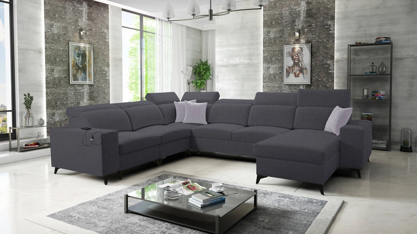 Die Abmessungen der Möbel ermöglichen füllung eines geräumigen Wohnzimmers oder Sitzungssaals. Breite der Ecke 361 cm, maximale Höhe 101 cm und Tiefe 283 cm. Die Liegefläche des Eckschrankes beträgt 122x283 cm. Die Sitzhöhe des Möbels beträgt 48 cm und die maximale Höhe der Rückenlehne beträgt 61 cm. Gewellte Federn und T30-Polyurethanschaum ist das Material, aus dem der Sitz der Ecke hergestellt ist. Feste Rückenlehne mit verstellbaren Kopfstützen garantiert komfortable Entspannung nach einem langen Tag, die Sie, Ihre Lieben und auch Gäste, die auf diesem einzigartigen Ecksofa sitzen, zu schätzen wissen werden.
