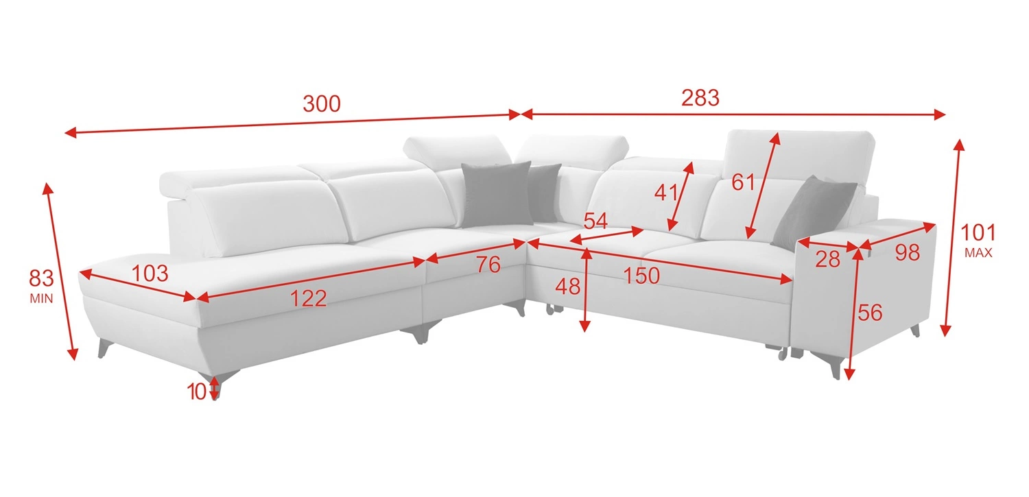 Die Abmessungen der Möbel ermöglichen füllung eines geräumigen Wohnzimmers oder Sitzungssaals. Breite der Ecke 283 cm, maximale Höhe 101 cm und einer Tiefe von 300 cm. Die Liegefläche des Eckschrankes beträgt 122x202 cm. Die Sitzhöhe des Möbels beträgt 48 cm und die maximale Höhe der Rückenlehne beträgt 61 cm. Gewellte Federn und T30-Polyurethanschaum ist das Material, aus dem der Sitz der Ecke hergestellt ist. Feste Rückenlehne mit verstellbaren Kopfstützen garantiert komfortable Entspannung nach einem langen Tag, die Sie, Ihre Lieben und auch Gäste, die auf diesem einzigartigen Ecksofa sitzen, zu schätzen wissen werden.