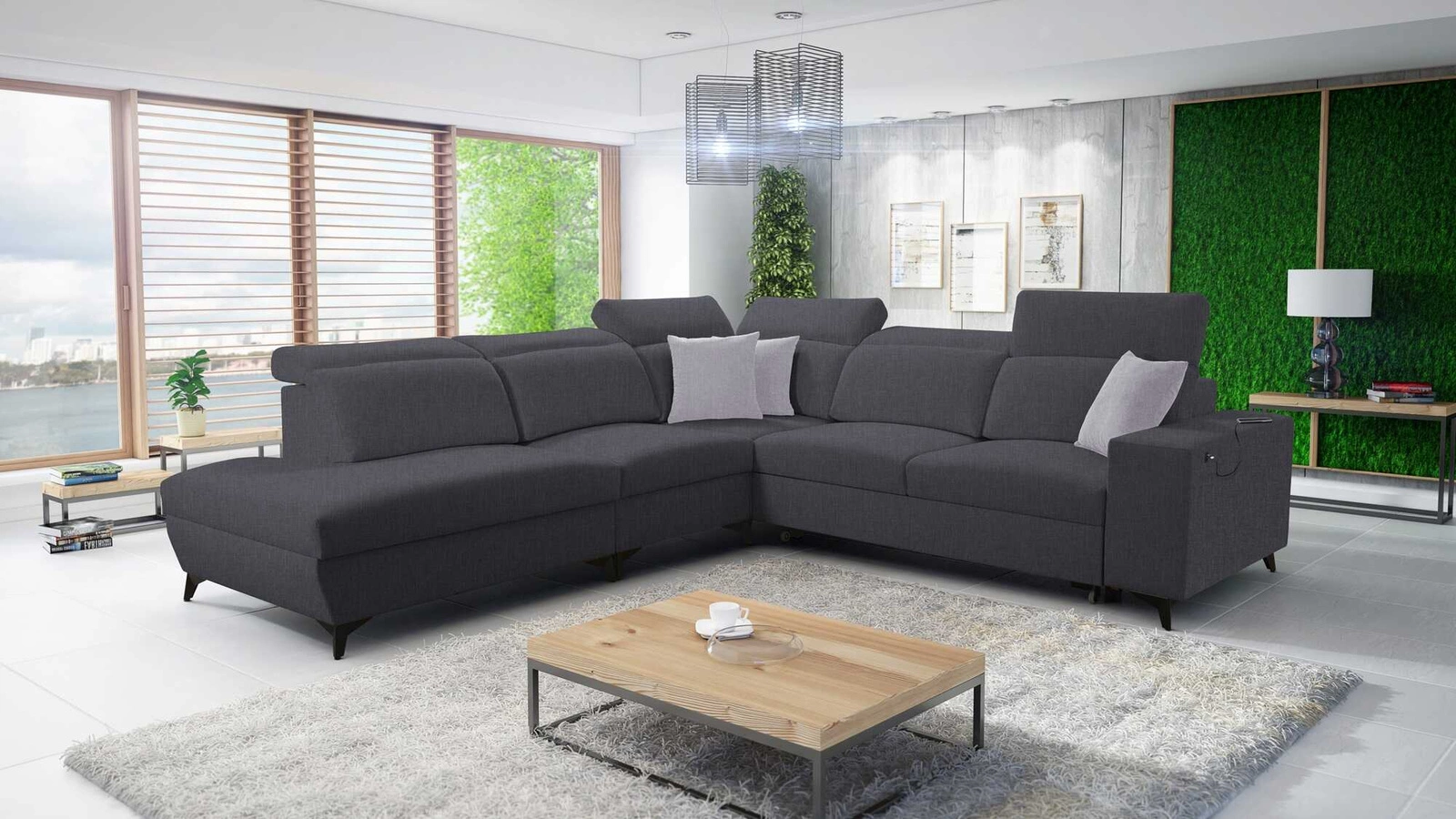 Ecksofa mit Schlaffunktion Kelly Sleek IX graphit links stilvolles Ecksofa mit bequemen Armlehnen und verstellbaren Kopfstützen