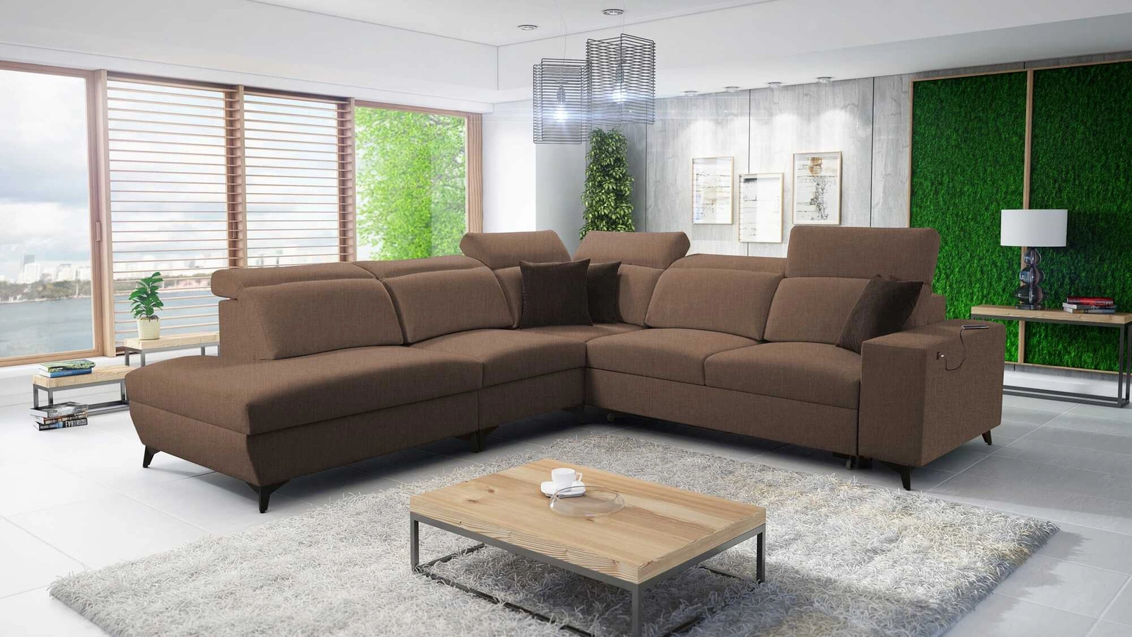 Ecksofa mit Schlaffunktion Kelly Sleek IX hellbraun linke Seite stilvolles Ecksofa mit bequemen Armlehnen und verstellbaren Kopfstützen