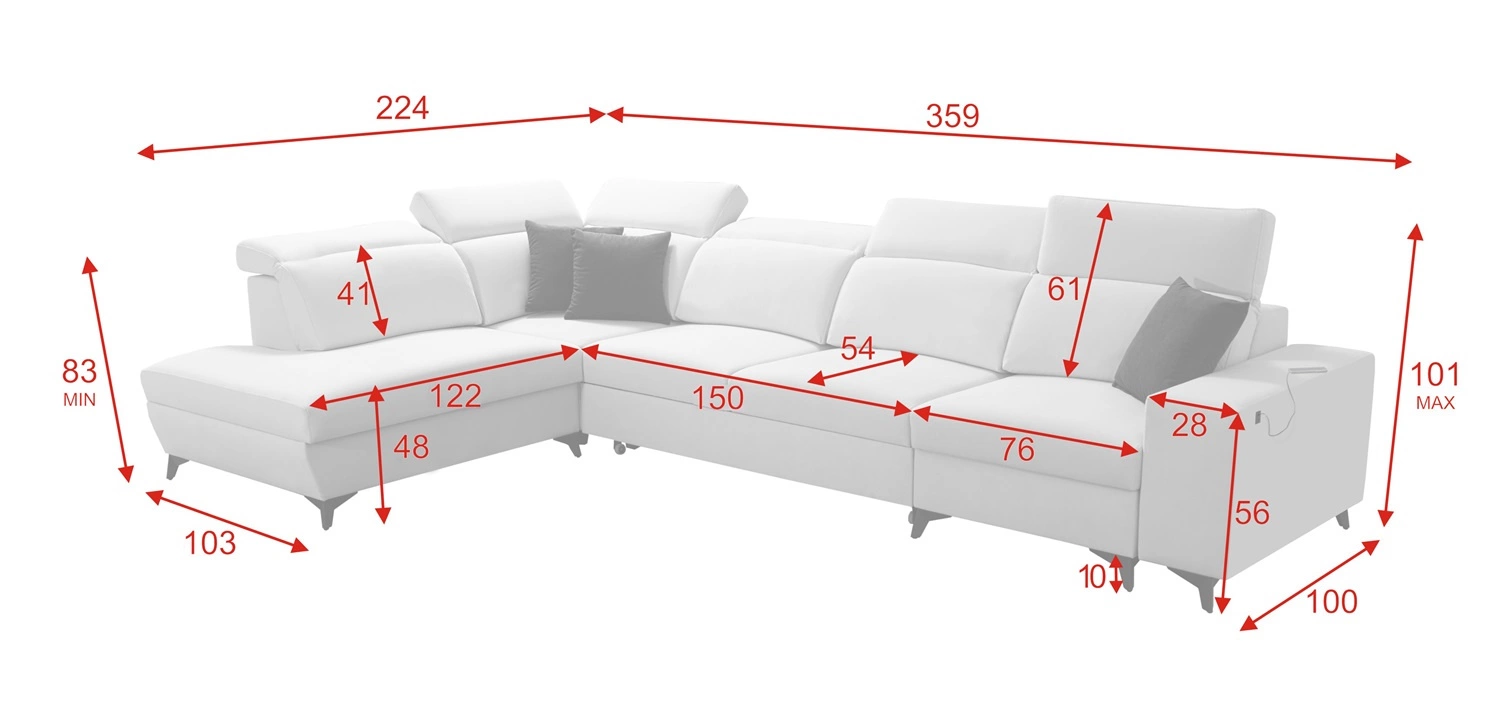 Die Abmessungen der Möbel ermöglichen füllung eines geräumigen Wohnzimmers oder Sitzungssaals. Breite der Ecke 359 cm, maximale Höhe 101 cm und Tiefe 224 cm. Die Liegefläche des Eckschrankes beträgt 122x202 cm. Die Sitzhöhe des Möbels beträgt 48 cm und die maximale Höhe der Rückenlehne beträgt 61 cm. Gewellte Federn und T30-Polyurethanschaum ist das Material, aus dem der Sitz der Ecke hergestellt ist. Feste Rückenlehne mit verstellbaren Kopfstützen garantiert komfortable Entspannung nach einem langen Tag, die Sie, Ihre Lieben und auch Gäste, die auf diesem einzigartigen Ecksofa sitzen, zu schätzen wissen werden.