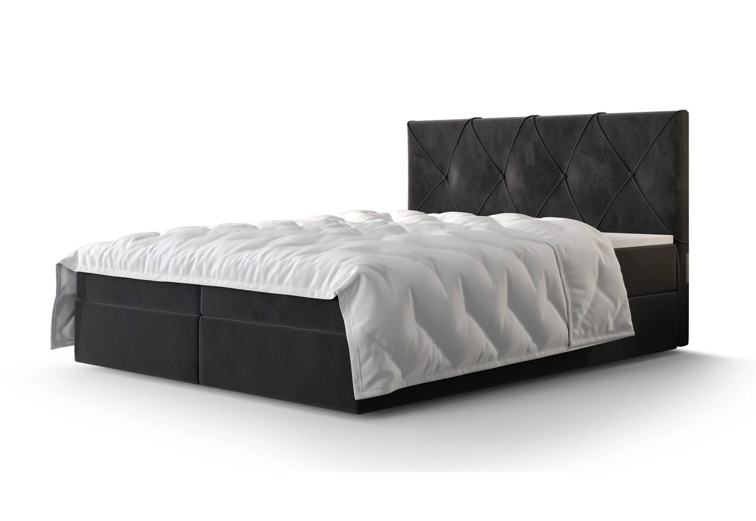 Bett aus Stoff typ samt Monolith 97 garantiert ein Höchstmaß an Komfort und Funktionalität für die tägliche Entspannung im Schlafzimmer. Der Stoff hat eine Beschichtung aus hydrophob, was eine begrenzte Flüssigkeitsaufnahme gewährleistet. Die interessante Struktur des Gewebes verleiht einen einzigartigen Charakter. Dank der Eigenschaften des verwendeten Stoffes behält das kontinentale Bett lange Zeit sein ursprüngliches Aussehen. Das Design des Bettes bietet große Stabilität und Komfort bei der Benutzung. Der Rahmen des kontinentalen Bettes ist aus Holz und einer Möbelplatte gefertigt. Zart gesteppt das Kopfteil ist ein Blickfang und verleiht dem Bett einen besonderen Charakter.