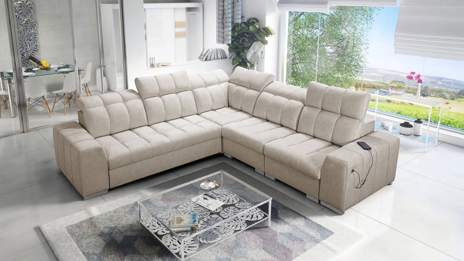Ecksofa Luigi III in Beige mit verstellbaren Kopfstützen ist ein reizvolles Möbelstück mit der Garantie für höchsten Komfort und Funktionalität.