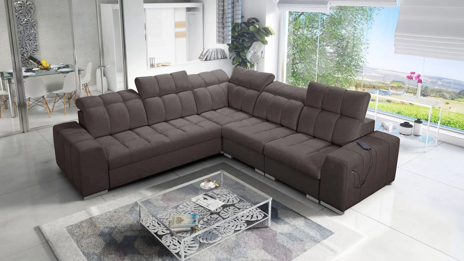 Ecksofa Luigi III in braun mit verstellbaren Kopfstützen ist ein reizvolles Möbelstück mit der Garantie für höchsten Komfort und Funktionalität.