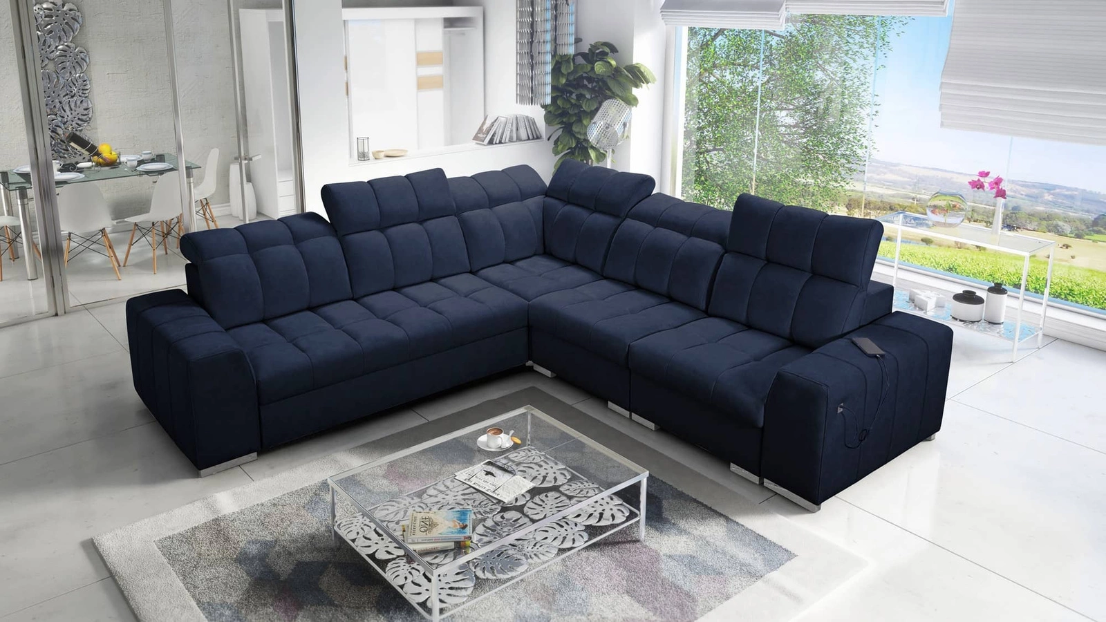 Ecksofa Luigi III in marineblau mit verstellbaren Kopfstützen ist ein reizvolles Möbelstück mit der Garantie für höchsten Komfort und Funktionalität.