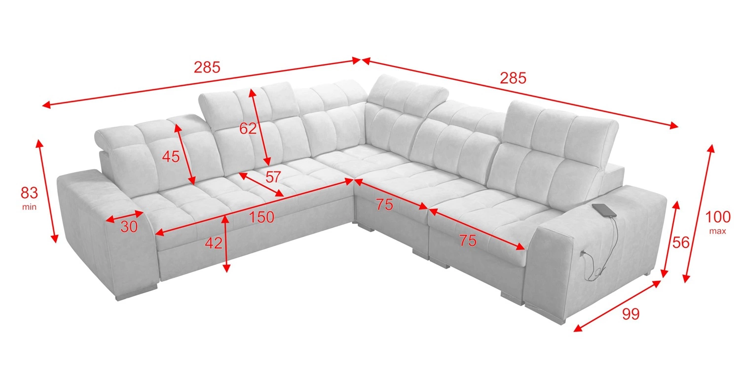 Abmessungen der Möbel ermöglichen füllung eines geräumigen Wohnzimmers oder Sitzungssaals. Breite der Ecke 285 cm, maximale Höhe 100 cm und Tiefe 285 cm. Die Liegefläche der Eckeinheit beträgt 127x210 cm. Die Sitzhöhe des Möbels beträgt 42 cm und die maximale Höhe der Rückenlehne beträgt 62 cm. Gewellte Federn und T30-Polyurethanschaum ist das Material, aus dem der Sitz der Ecke hergestellt ist. Feste Rückenlehne mit verstellbaren Kopfstützen ermöglicht eine einfache anpassung sie können die Neigung der Kopfstützen nach Ihren Wünschen einstellen und so für eine bequeme Erholung nach einem langen Tag sorgen, die Sie, Ihre Lieben und auch Ihre Gäste, die auf diesem einzigartigen Ecksofa Platz nehmen, zu schätzen wissen werden.