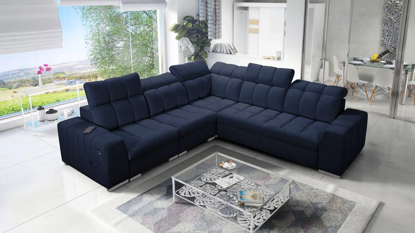 Ecksofa Luigi III in marineblau mit verstellbaren Kopfstützen ist ein reizvolles Möbelstück mit der Garantie für höchsten Komfort und Funktionalität.