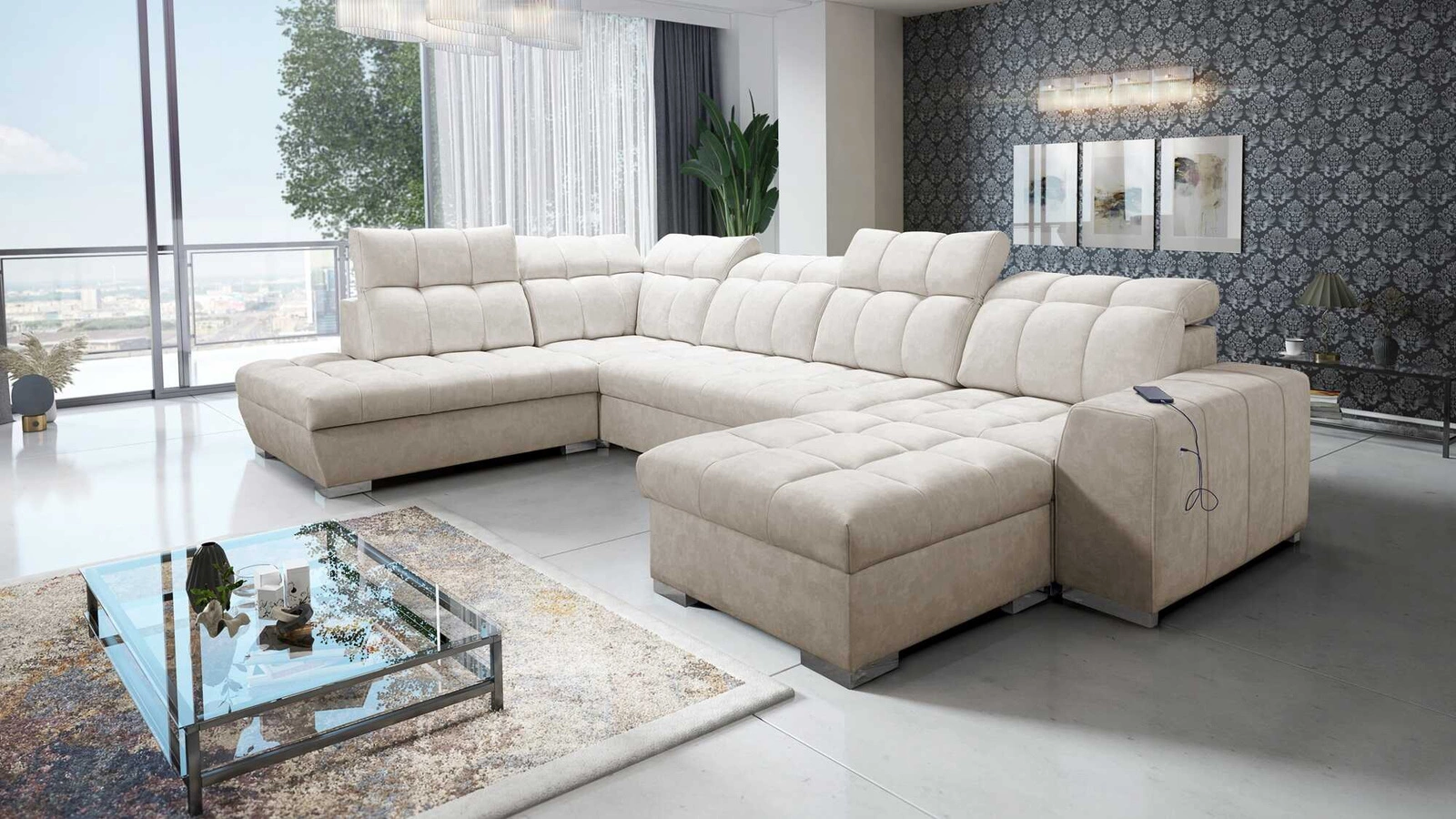 Ecksofa Luigi VI in Beige mit verstellbaren Kopfstützen ist ein reizvolles Möbelstück mit der Garantie für höchsten Komfort und Funktionalität.