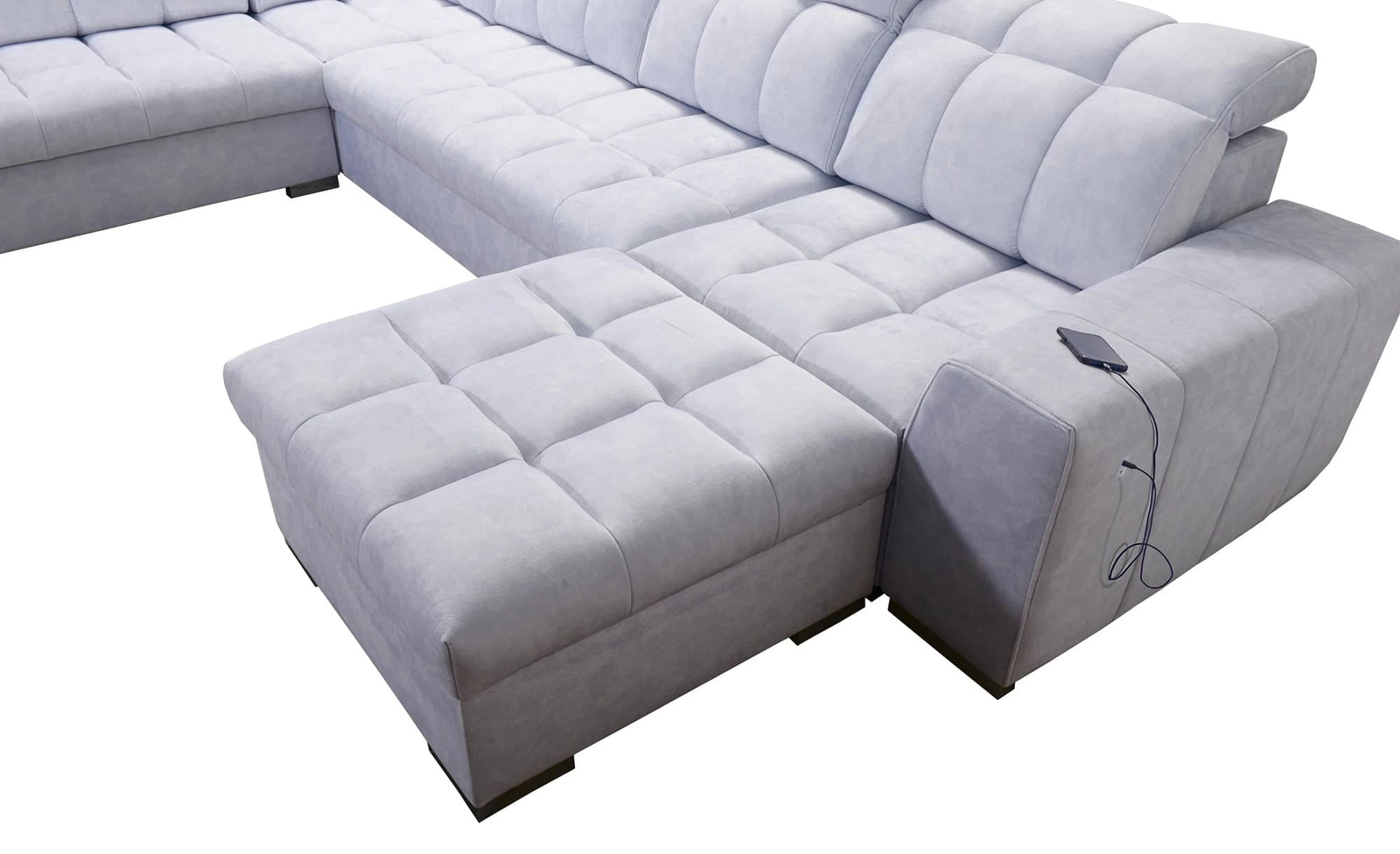 Abmessungen der Möbel ermöglichen füllung eines geräumigen Wohnzimmers oder Sitzungssaals. Breite der Ecke 364 cm, maximale Höhe 100 cm und Tiefe 225 cm. Die Liegefläche der Eckeinheit beträgt 133x282 cm. Die Sitzhöhe des Möbels beträgt 42 cm und die maximale Höhe der Rückenlehne beträgt 62 cm. Gewellte Federn und T30-Polyurethanschaum ist das Material, aus dem der Sitz der Ecke hergestellt ist. Feste Rückenlehne mit verstellbaren Kopfstützen ermöglicht eine einfache anpassung sie können die Neigung der Kopfstützen nach Ihren Wünschen einstellen und so für eine bequeme Erholung nach einem langen Tag sorgen, die Sie, Ihre Lieben und auch Ihre Gäste, die auf diesem einzigartigen Ecksofa Platz nehmen, zu schätzen wissen werden.