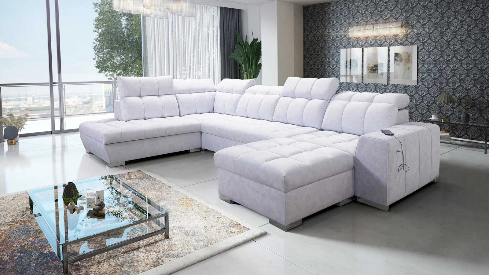 Abmessungen der Möbel ermöglichen füllung eines geräumigen Wohnzimmers oder Sitzungssaals. Breite der Ecke 364 cm, maximale Höhe 100 cm und Tiefe 225 cm. Die Liegefläche der Eckeinheit beträgt 133x282 cm. Die Sitzhöhe des Möbels beträgt 42 cm und die maximale Höhe der Rückenlehne beträgt 62 cm. Gewellte Federn und T30-Polyurethanschaum ist das Material, aus dem der Sitz der Ecke hergestellt ist. Feste Rückenlehne mit verstellbaren Kopfstützen ermöglicht eine einfache anpassung sie können die Neigung der Kopfstützen nach Ihren Wünschen einstellen und so für eine bequeme Erholung nach einem langen Tag sorgen, die Sie, Ihre Lieben und auch Ihre Gäste, die auf diesem einzigartigen Ecksofa Platz nehmen, zu schätzen wissen werden.