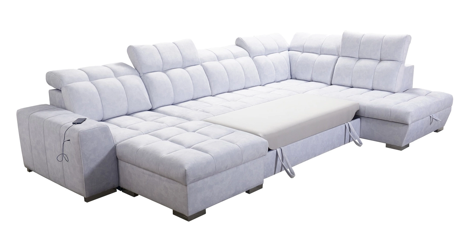 Die Extras dieses Möbels, die alle Nutzer zu schätzen wissen werden, sind die Bettzeugbehälter, die Schlaffunktion und die USB-Ladebuchse an der Seite des Eckschranks.
