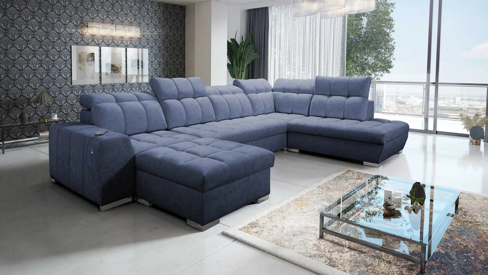 Ecksofa Luigi VI in blau mit verstellbaren Kopfstützen ist ein reizvolles Möbelstück mit der Garantie für höchsten Komfort und Funktionalität.