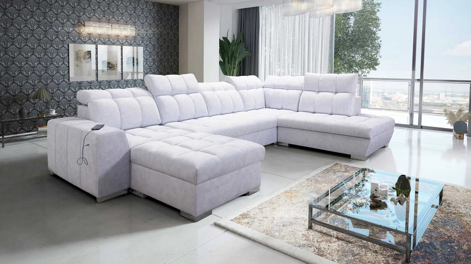 Abmessungen der Möbel ermöglichen füllung eines geräumigen Wohnzimmers oder Sitzungssaals. Breite der Ecke 364 cm, maximale Höhe 100 cm und Tiefe 225 cm. Die Liegefläche der Eckeinheit beträgt 133x282 cm. Die Sitzhöhe des Möbels beträgt 42 cm und die maximale Höhe der Rückenlehne beträgt 62 cm. Gewellte Federn und T30-Polyurethanschaum ist das Material, aus dem der Sitz der Ecke hergestellt ist. Feste Rückenlehne mit verstellbaren Kopfstützen ermöglicht eine einfache anpassung sie können die Neigung der Kopfstützen nach Ihren Wünschen einstellen und so für eine bequeme Erholung nach einem langen Tag sorgen, die Sie, Ihre Lieben und auch Ihre Gäste, die auf diesem einzigartigen Ecksofa Platz nehmen, zu schätzen wissen werden.