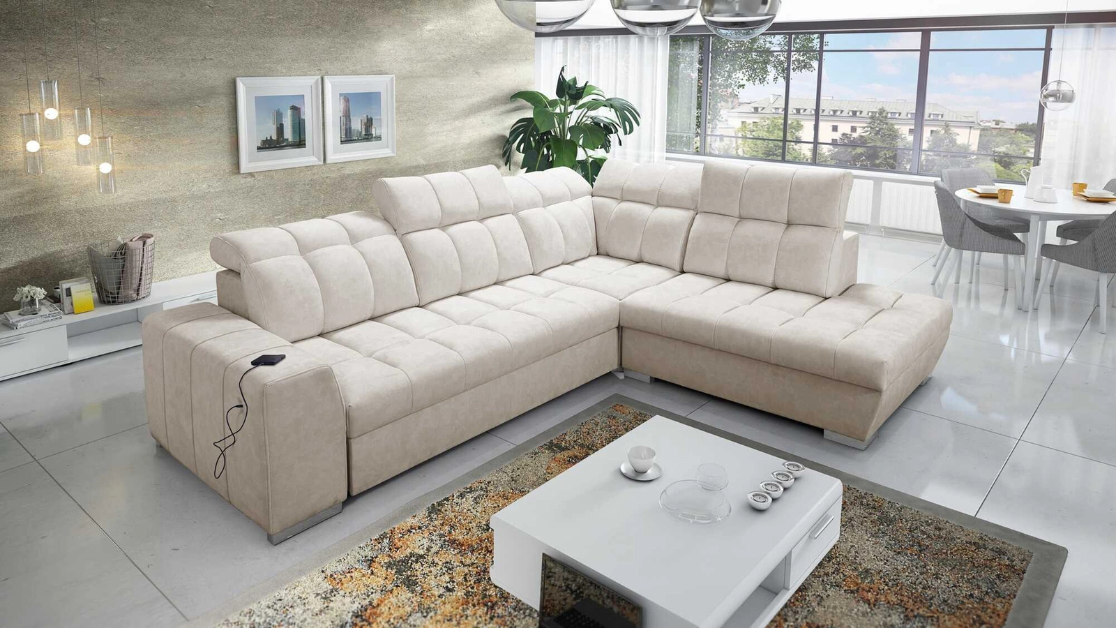 Die Extras dieses Möbels, die alle Nutzer schätzen werden, sind der Bettzeugbehälter, die Schlaffunktion und die USB-Ladebuchse an der Seite des Eckmöbels.