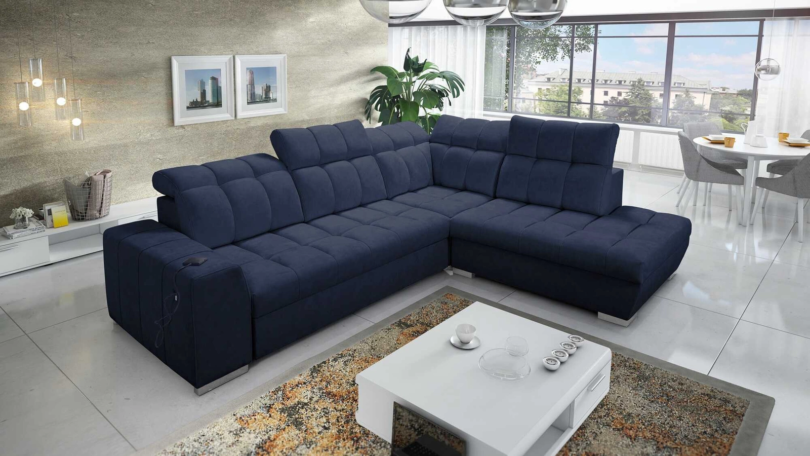 Ecksofa Luigi VII in marineblau mit verstellbaren Kopfstützen ist ein stilvolles Möbelstück mit der Garantie für höchsten Komfort und Funktionalität.