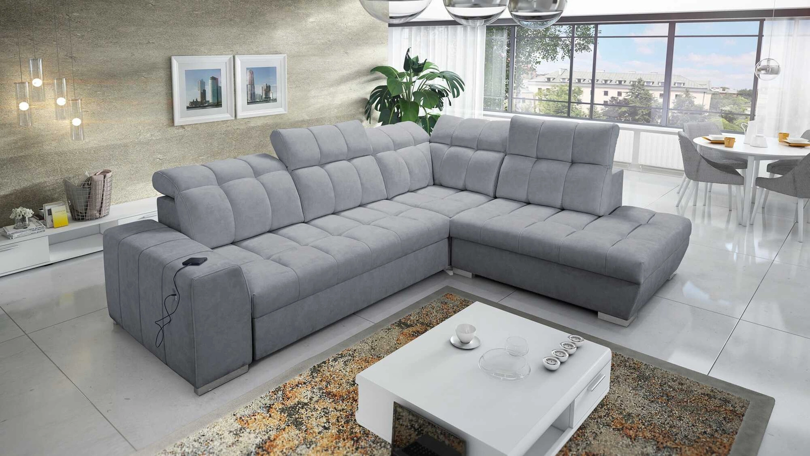 Die Extras dieses Möbels, die alle Nutzer schätzen werden, sind der Bettzeugbehälter, die Schlaffunktion und die USB-Ladebuchse an der Seite des Eckmöbels.