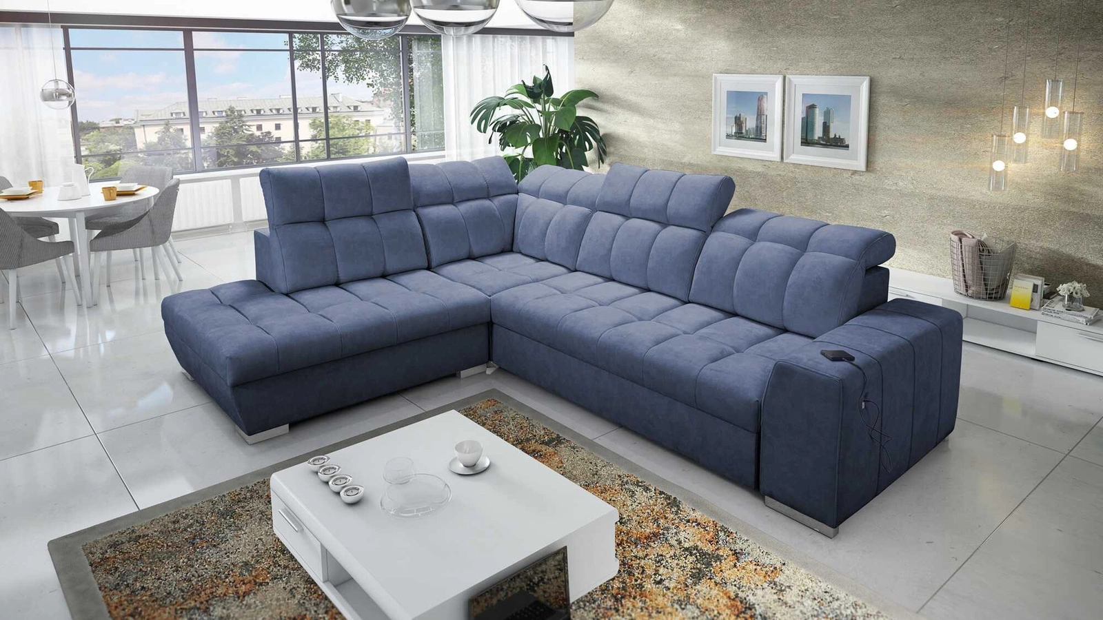 Ecksofa Luigi VII in blau mit verstellbaren Kopfstützen ist ein stilvolles Möbelstück mit der Garantie für höchsten Komfort und Funktionalität.