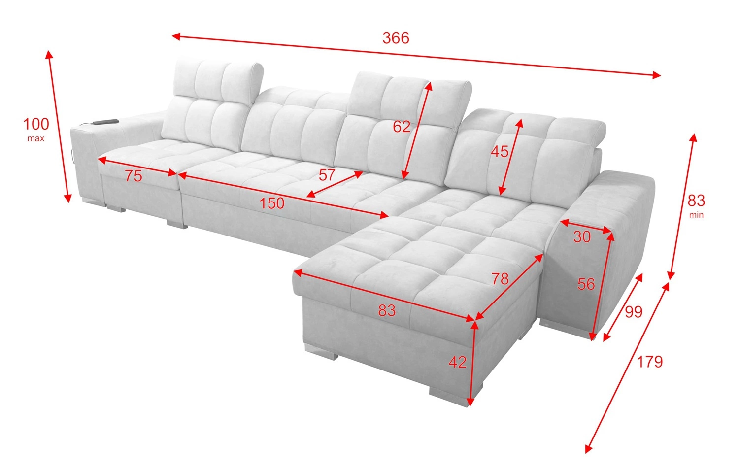 Abmessungen der Möbel ermöglichen füllung eines geräumigen Wohnzimmers oder Sitzungssaals. Breite der Ecke 366 cm, maximale Höhe 100 cm und Tiefe 179 cm. Die Liegefläche der Eckeinheit beträgt 127x226 cm. Die Sitzhöhe des Möbels beträgt 42 cm und die maximale Höhe der Rückenlehne beträgt 62 cm. Gewellte Federn und T30-Polyurethanschaum ist das Material, aus dem der Sitz der Ecke hergestellt ist. Feste Rückenlehne mit verstellbaren Kopfstützen ermöglicht eine einfache anpassung sie können die Neigung der Kopfstützen nach Ihren Wünschen einstellen und so für eine bequeme Erholung nach einem langen Tag sorgen, die Sie, Ihre Lieben und auch Ihre Gäste, die auf diesem einzigartigen Ecksofa Platz nehmen, zu schätzen wissen werden.