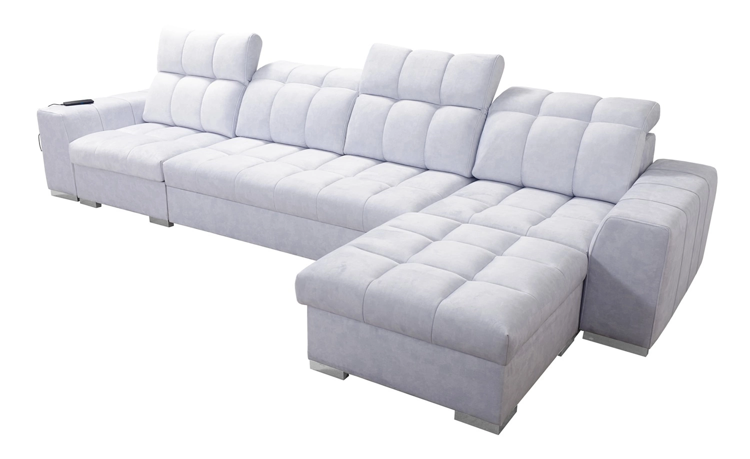 Abmessungen der Möbel ermöglichen füllung eines geräumigen Wohnzimmers oder Sitzungssaals. Breite der Ecke 366 cm, maximale Höhe 100 cm und Tiefe 179 cm. Die Liegefläche der Eckeinheit beträgt 127x226 cm. Die Sitzhöhe des Möbels beträgt 42 cm und die maximale Höhe der Rückenlehne beträgt 62 cm. Gewellte Federn und T30-Polyurethanschaum ist das Material, aus dem der Sitz der Ecke hergestellt ist. Feste Rückenlehne mit verstellbaren Kopfstützen ermöglicht eine einfache anpassung sie können die Neigung der Kopfstützen nach Ihren Wünschen einstellen und so für eine bequeme Erholung nach einem langen Tag sorgen, die Sie, Ihre Lieben und auch Ihre Gäste, die auf diesem einzigartigen Ecksofa Platz nehmen, zu schätzen wissen werden.