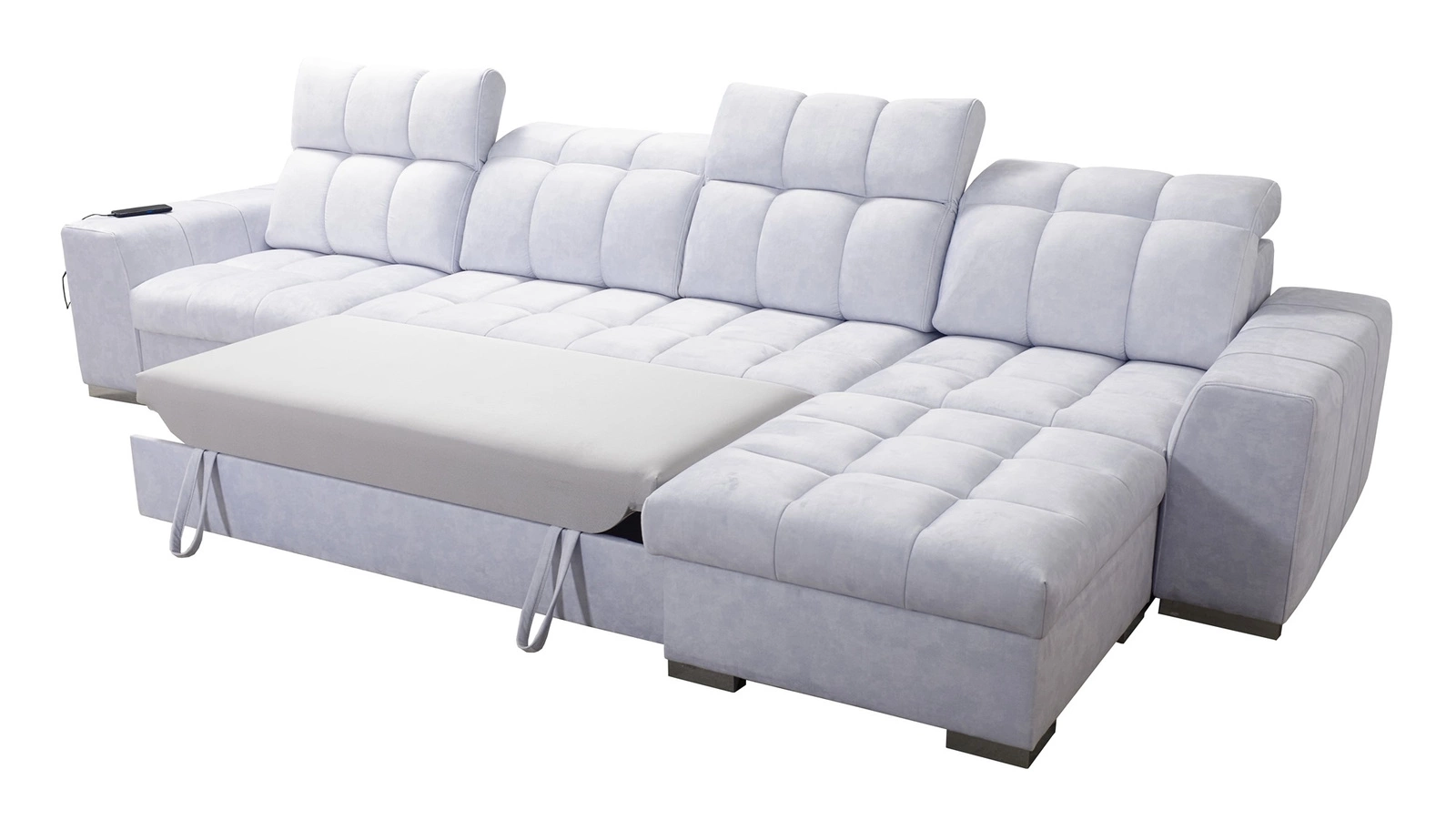 Die Extras dieses Möbels, die alle Nutzer zu schätzen wissen werden, sind die Bettzeugbehälter, die Schlaffunktion und die USB-Ladebuchse an der Seite des Eckschranks.