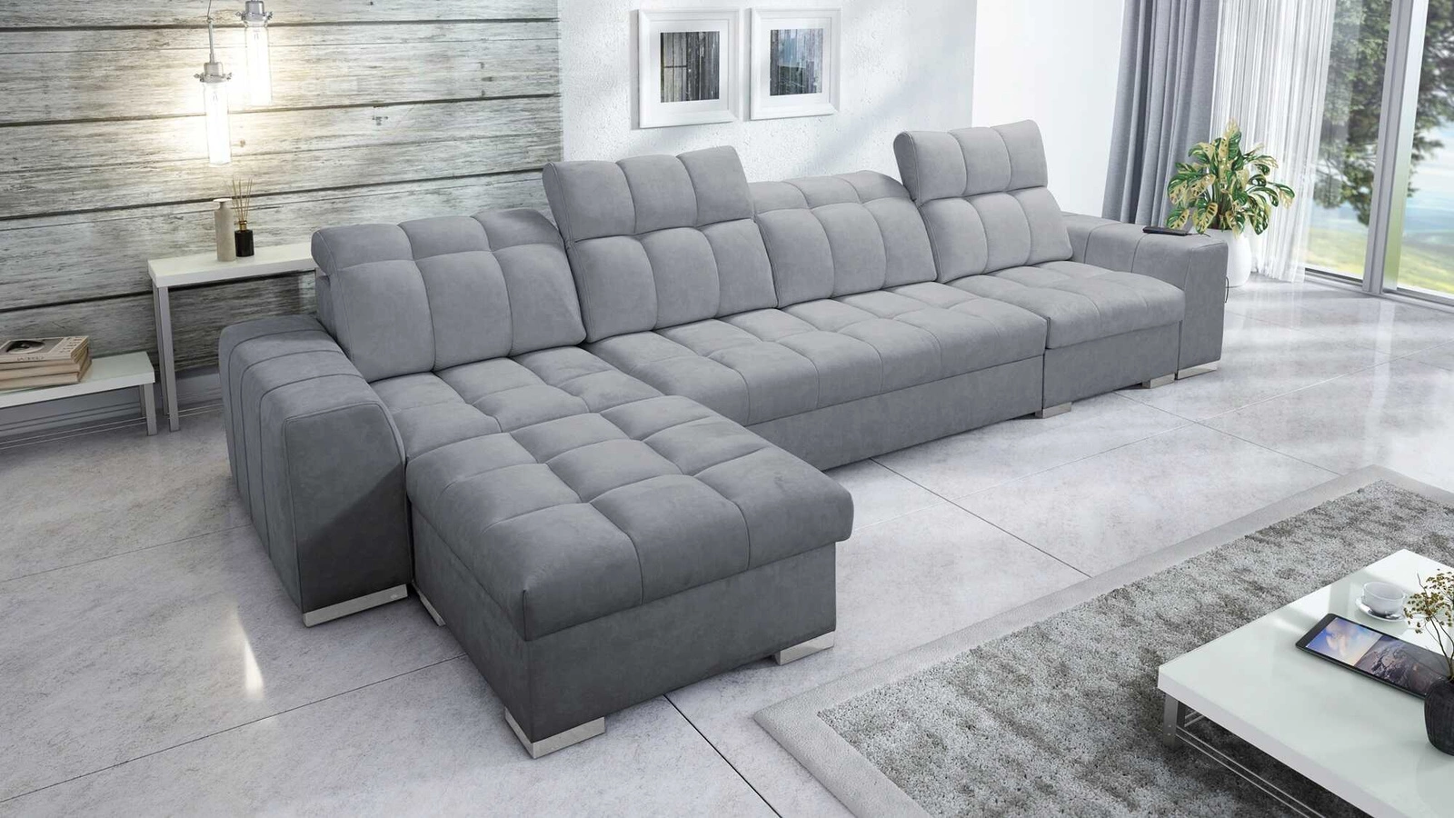Ecksofa Luigi XII in grau mit verstellbaren Kopfstützen ist ein stilvolles Möbelstück mit der Garantie für höchsten Komfort und Funktionalität.