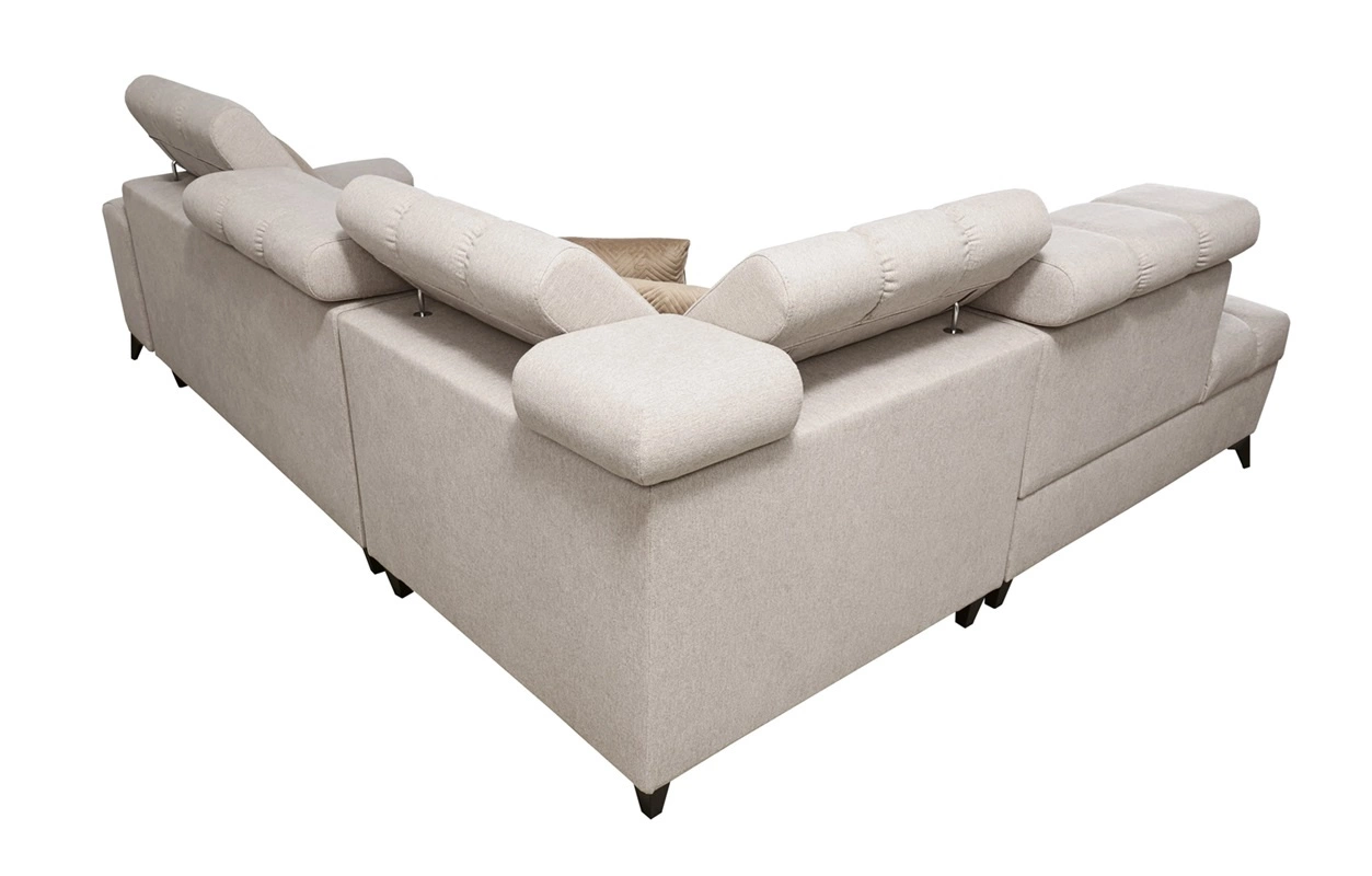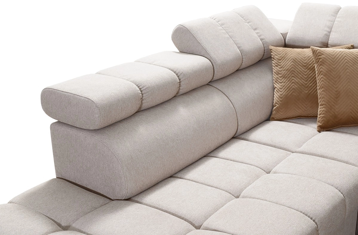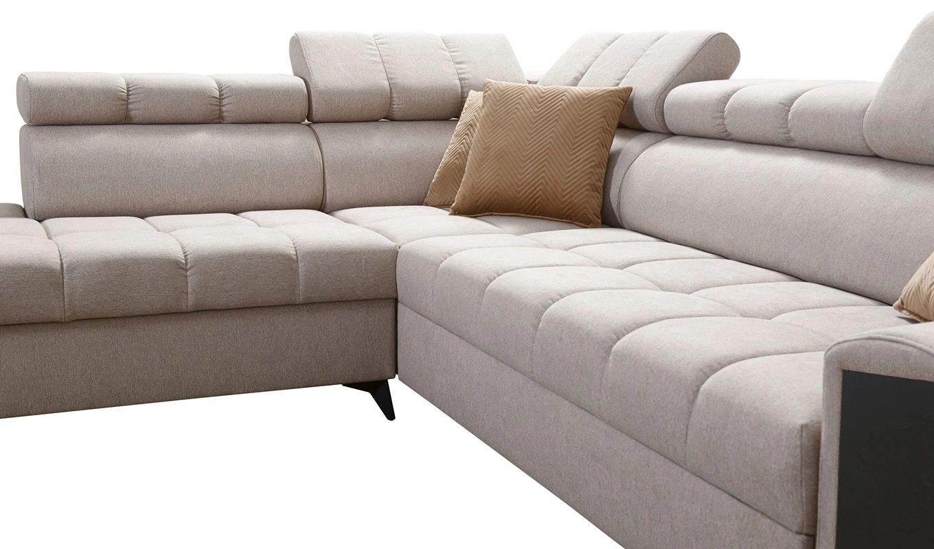 Die Abmessungen der Möbel ermöglichen platz in einem geräumigen Wohnzimmer oder Sitzungssaal zu schaffen. Breite der Ecke 280 cm, maximale Höhe 100 cm und Tiefe 217 cm. Die Liegefläche der Eckeinheit beträgt 127x210 cm. Die Sitzhöhe des Möbels beträgt 45 cm und die maximale Höhe der Rückenlehne beträgt 60 cm. Gewellte Federn und T30-Polyurethanschaum ist das Material, aus dem der Sitz der Ecke hergestellt ist. Rückendeckung mit verstellbaren Kopfstützen ermöglicht es Ihnen, den Winkel der Kopfstützen nach Ihren Wünschen einzustellen und garantiert Ihnen eine bequeme Erholung nach einem langen Tag, die Sie, Ihre Lieben und auch Ihre Gäste, die auf diesem einzigartigen Ecksofa sitzen, zu schätzen wissen werden.