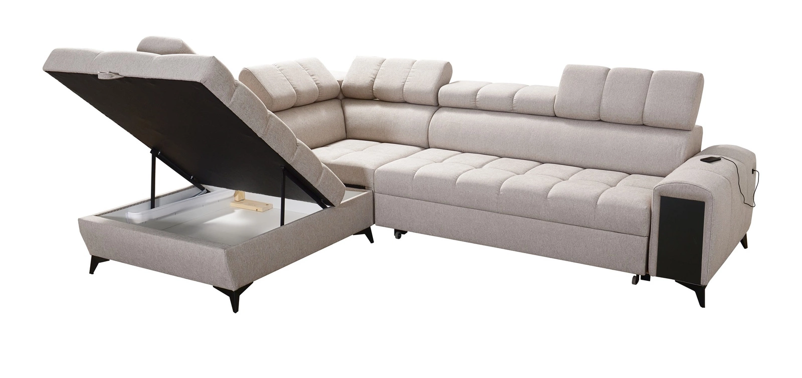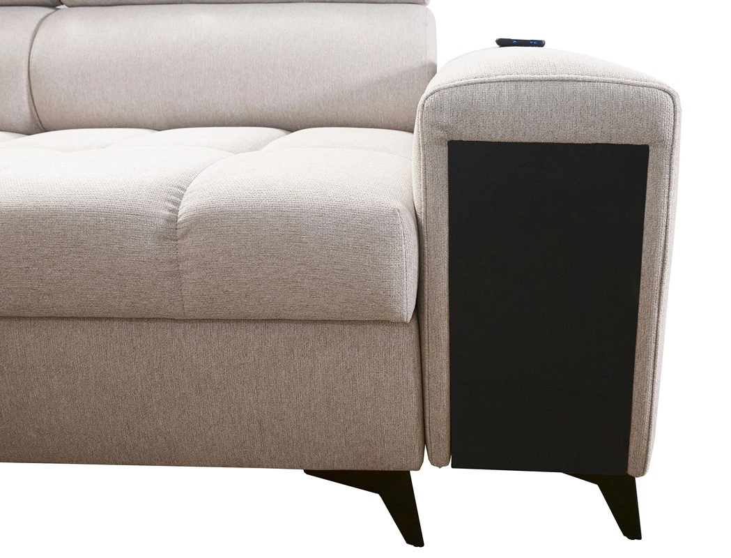 Weitere Merkmale dieses Möbelstücks, die von allen Nutzern geschätzt werden, sind ein Bettzeugbehälter, eine Schlaffunktion, eine USB-Ladebuchse in der Seite des Eckmöbels und eine Schublade mit Vollauszug in der Seite des Möbels.
