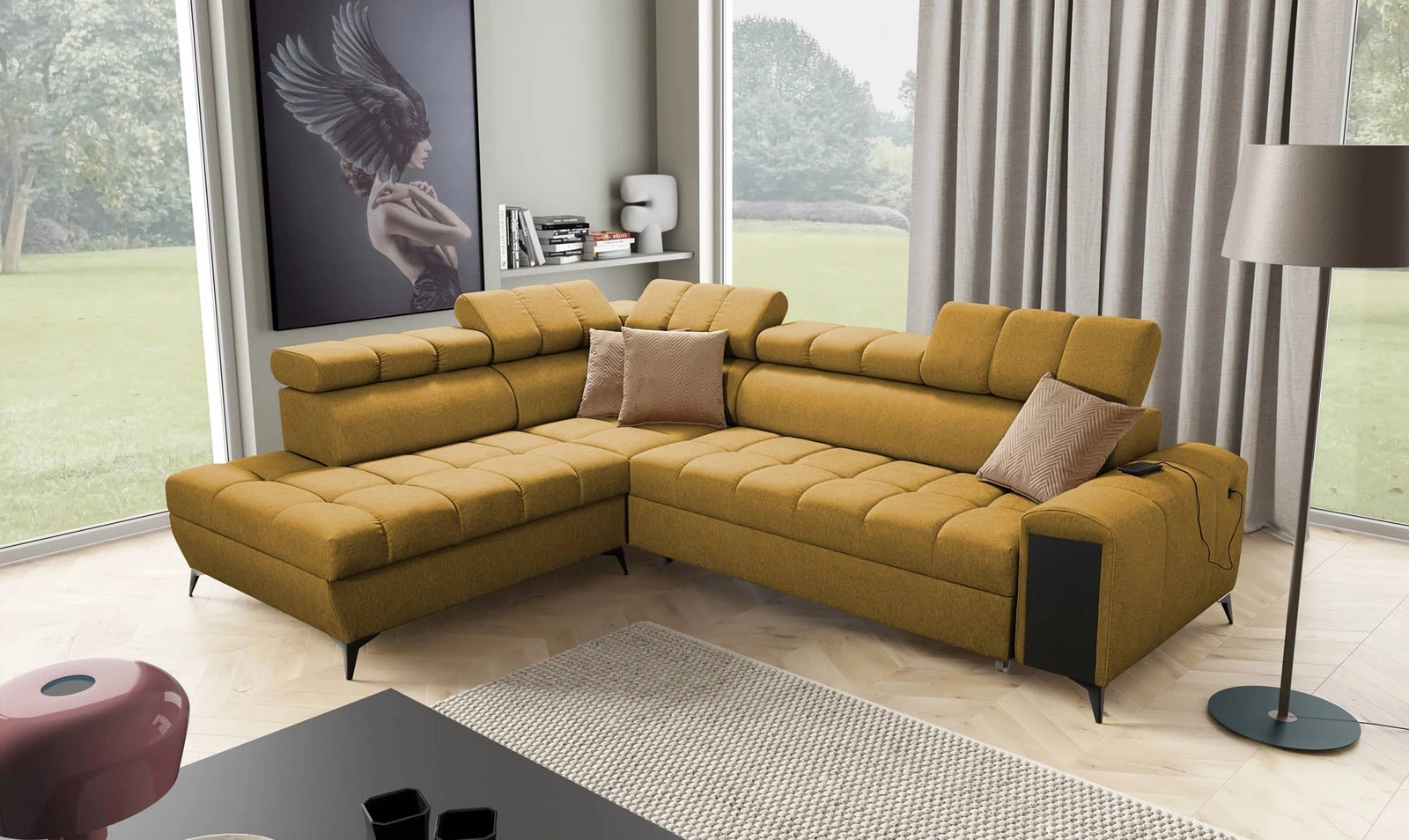 Bolmso Ecksofa VII in senf mit verstellbaren Kopfstützen ist ein reizvolles Möbelstück mit der Garantie für höchsten Komfort und Funktionalität.