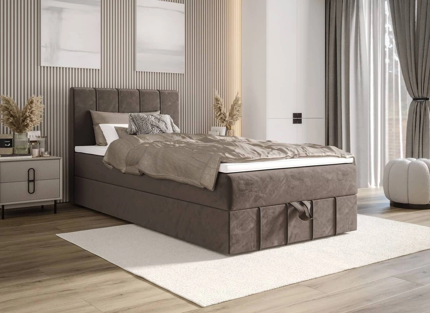 Bett aus Stoff typ samt Monolith 15 garantiert ein Höchstmaß an Komfort und Funktionalität für die tägliche Entspannung im Schlafzimmer. Der Stoff hat eine Beschichtung aus hydrophob, was eine begrenzte Flüssigkeitsaufnahme gewährleistet. Die interessante Struktur des Gewebes verleiht einen einzigartigen Charakter. Dank der Eigenschaften des verwendeten Stoffes behält das kontinentale Bett lange Zeit sein ursprüngliches Aussehen. Das Design des Bettes bietet große Stabilität und Komfort bei der Benutzung. Der Rahmen des kontinentalen Bettes ist aus Holz und einer Möbelplatte gefertigt. Vertikal nähen am Kopfteil sind ein Blickfang und verleihen dem Bett einen besonderen Charakter.