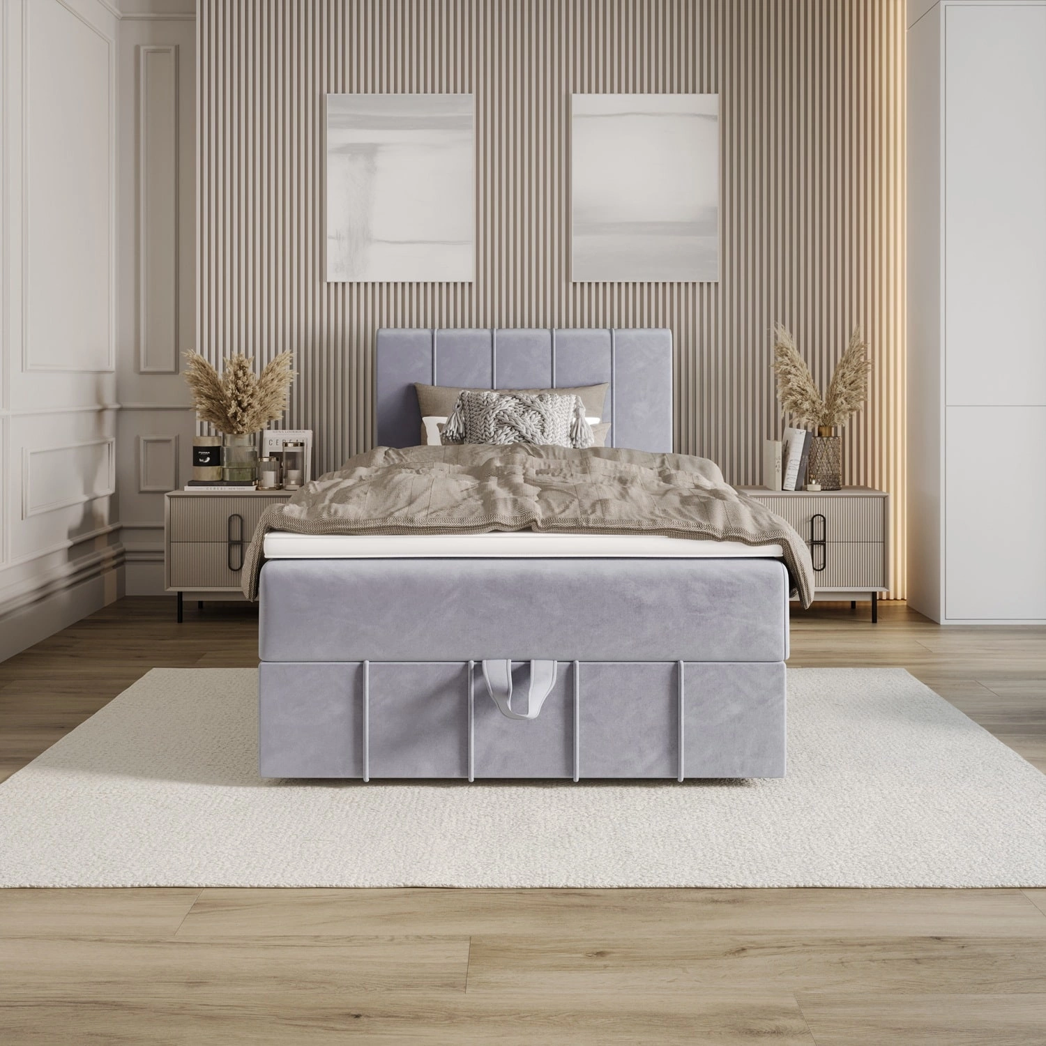 Für zusätzliche Funktionalität ist das Kontinentalbett mit einem einem großen Behälter, für die bequeme Aufbewahrung von wichtigem Zubehör. Der Zugang zum Bettkasten erfolgt durch Anheben der Matratze an der Vorderseite. Zuverlässige automatische Hebehilfen erleichtern die Arbeit.